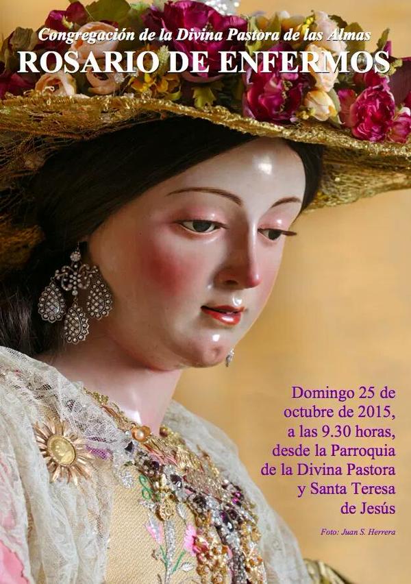 9.30h Rosario de Enfermos –  Divina Pastora,  La imagen de la Virgen pasará ante los domicilios de vecinos impedidos del barrio de Capuchinos en la mañana de este próximo domingo. El acto comenzará a las 9.30 horas, se trata de su anual rosario de enfermos, en el que la imagen de la Inmaculada Madre del Buen Pastor pasará ante los domicilios de vecinos del barrio de Capuchinos que se encuentran impedidos y postrados por la enfermedad. El rezo de los misterios del santo rosario estará acompañado por los sones de la Capilla Musical Nuestra Señora del Carmen Doloroso.