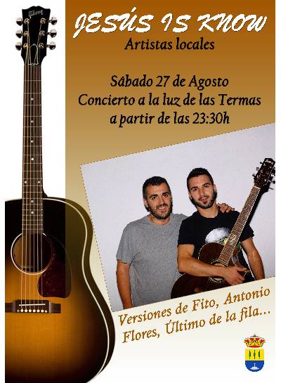 El Ayuntamiento de Alameda programa para este sábado 27 de Agosto celebración de un concierto a la luz de las termas a partir de las once y media de la noche con la participación de los artistas locales «Jesús is know», que interpretarán versiones de Fito, Antonio Flores o El Último de la Fila.