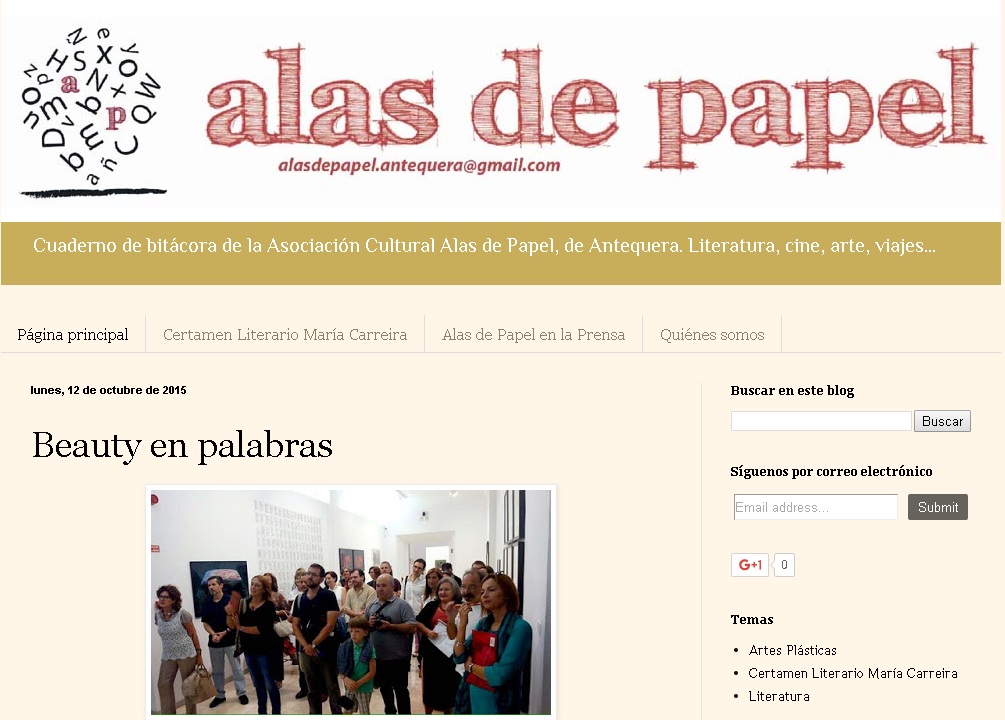 Alas de Papel ha puesto en marcha un blog de contenidos culturales, http://alasdepapelantequera.blogspot.com.es/, en un nuevo paso adelante para ampliar el alcance de su actividad y difundir los valores no sólo de la escritura y la lectura, sino también de cualquier otra manifestación creativa.