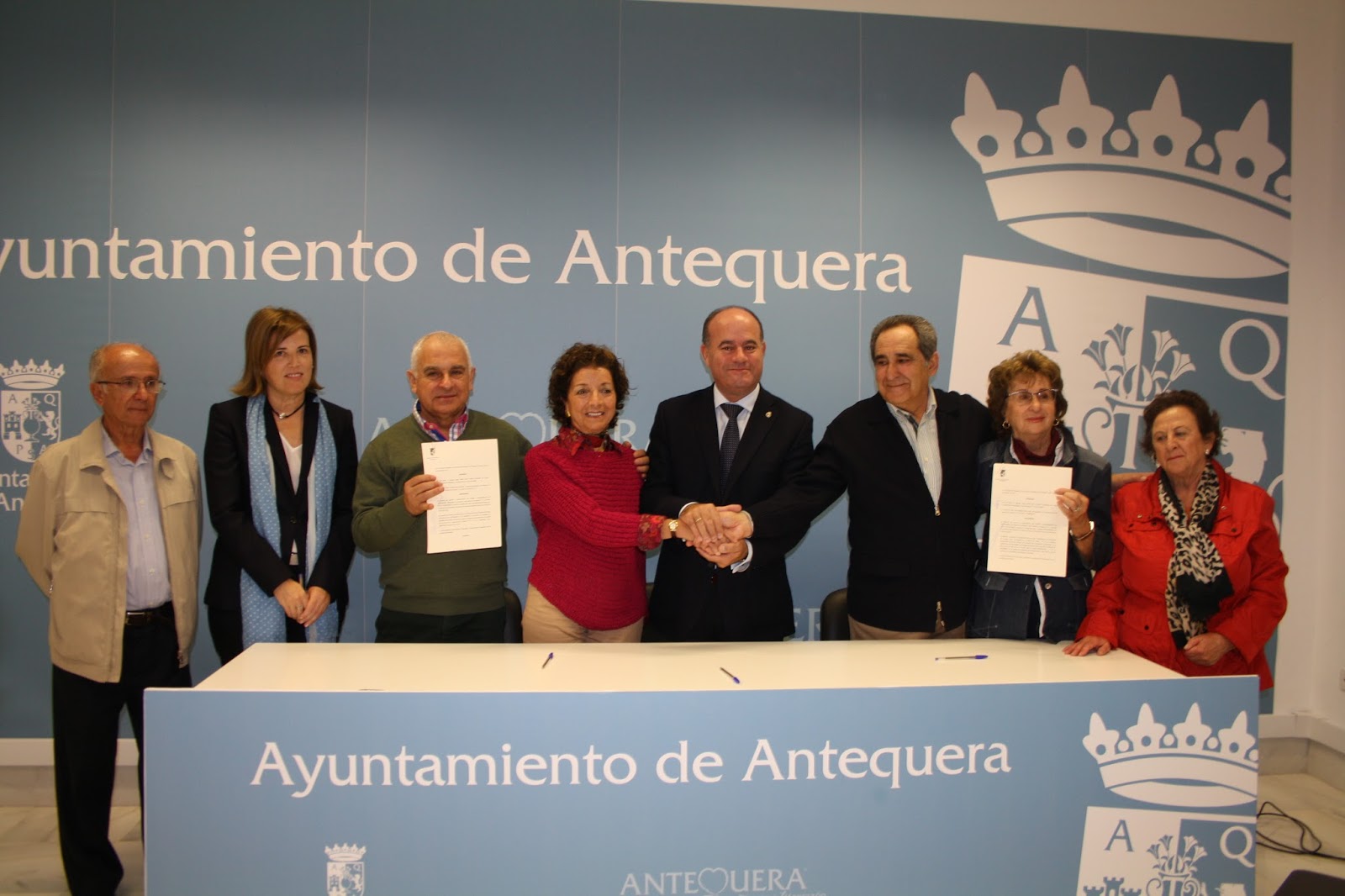 El Ayuntamiento de Antequera ha firmado este martes el convenio de cesión de terrenos municipales con ADIPA y la cooperativa residencial 51 para la construcción de sendas residencias para mayores y para adultos discapacitados.