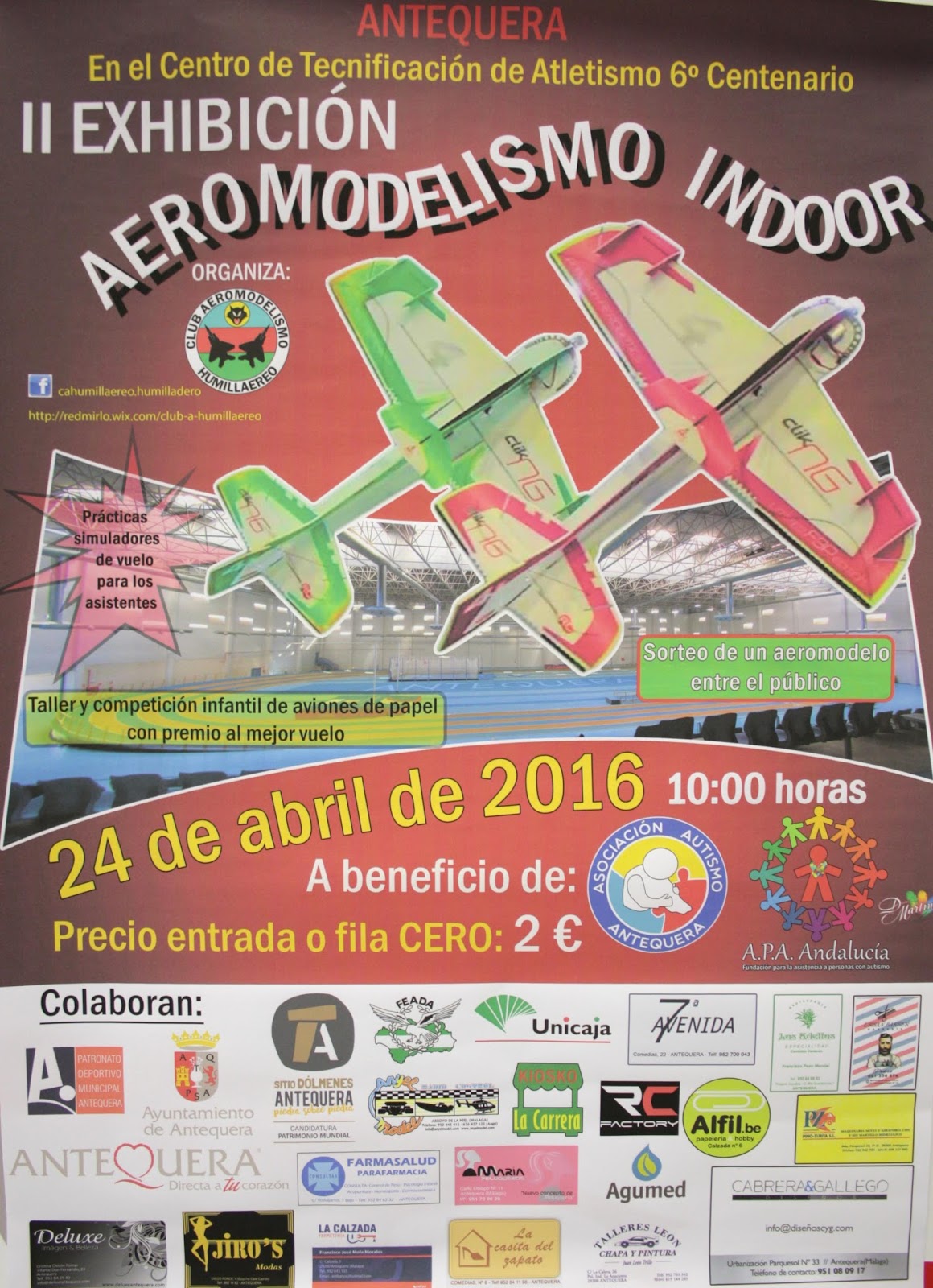 El Centro de Tecnificación de Atletismo de Antequera acoge el próximo día 24 de abril la ‘II Exhibición de Aeromodelismo Indoor’. Este encuentro, organizado por el Club de Aeromodelismo de Humilladero, congregará a medio centenar de aeromodelistas con un fin benéfico: recaudar fondos para la Asociación Autismo Antequera y para la APA Andalucía.