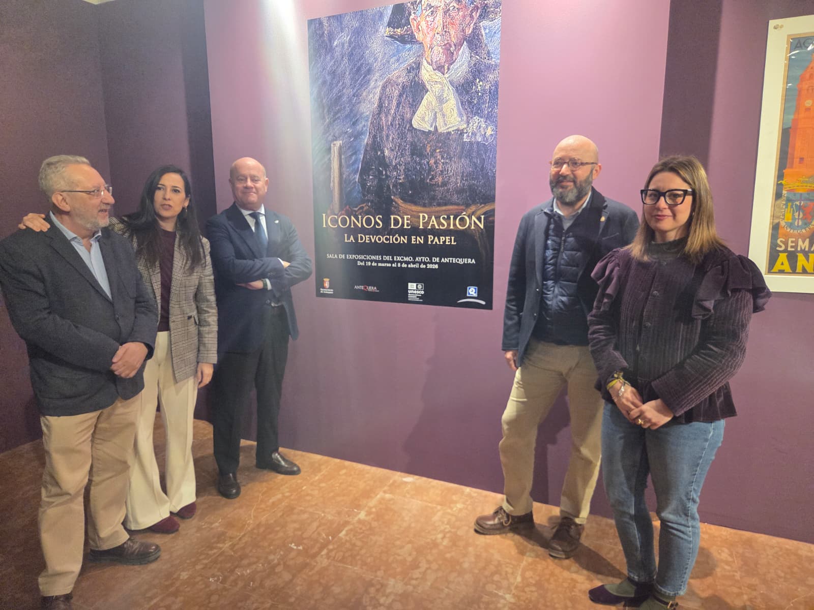El alcalde Manolo Barón, el responsable de Cultura, José Medina, el director del MVCA, José Escalante, y las responsables de Turismo y Tradición, Ana Cebrián y Elena Melero, respectivamente, han inaugurado la exposición ‘Iconos de Pasión: La devoción en papel’.