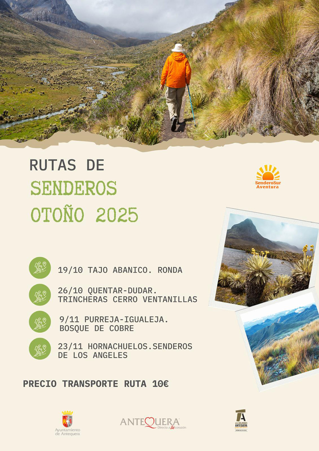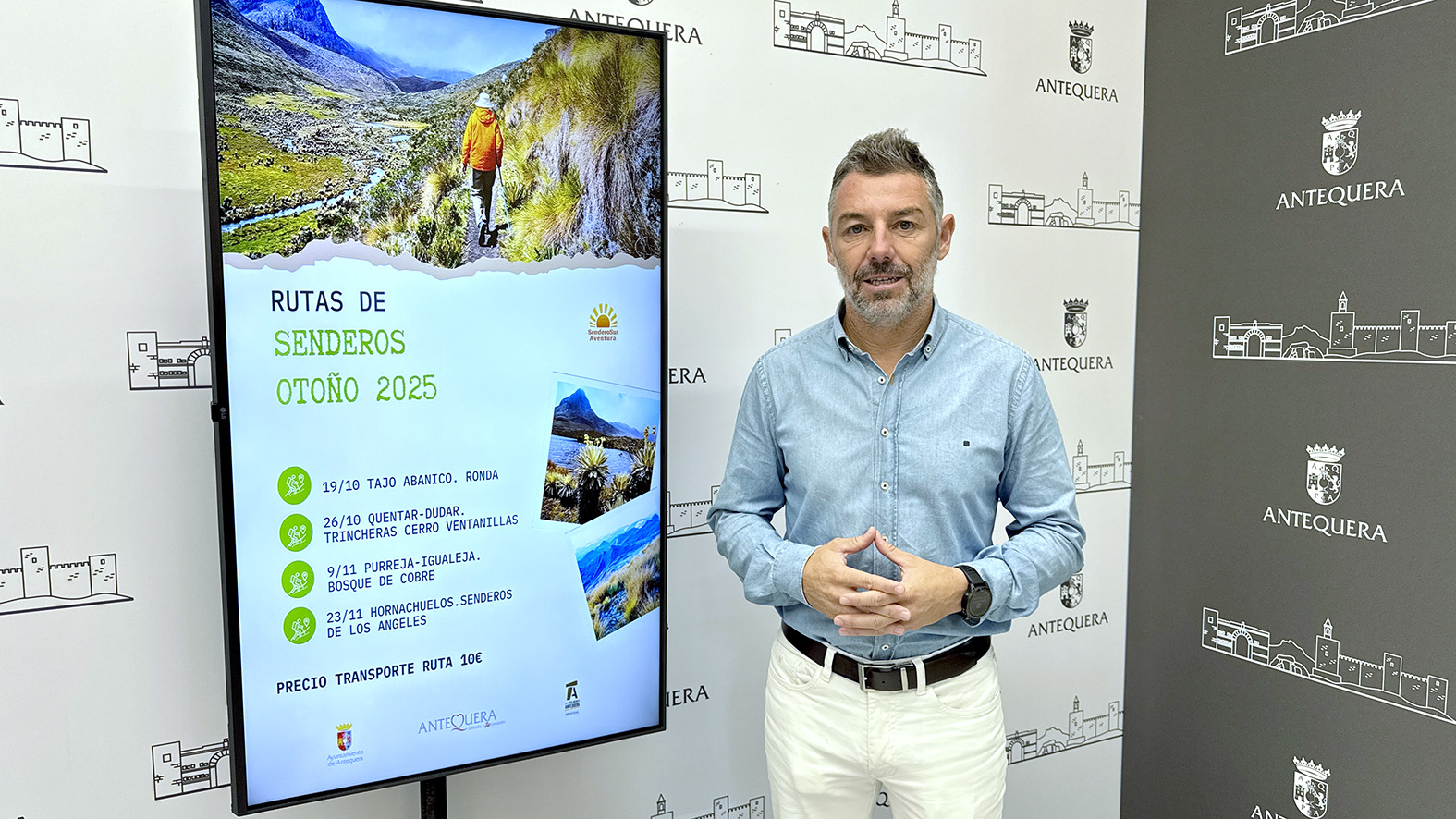 El teniente de alcalde delegado de Deportes, Juan Rosas, informa sobre la programación de una nueva edición de las Rutas de Senderos de Otoño, organizadas por el Área de Deportes en colaboración con la empresa antequerana Sendero Sur Aventura. El programa contempla cuatro salidas a lo largo de los meses de octubre y noviembre, con un precio único de 10 euros por ruta para cubrir el transporte, y con inscripción disponible a través de la web municipal.