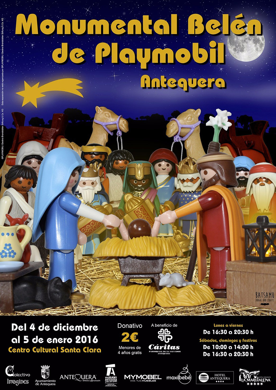 Este ‘Monumental Belén de Playmobil’ estará abierto del cuatro de diciembre al cinco de enero, en horario de 16.30-20.30 horas (lunes a viernes) y de 10.00-14.00 y 16.30-20.30 (sábado, domingos y festivos). Ha explicado la concejal Belén Jiménez. La entrada al recinto costará dos euros (niños gratis), donativo que se destinará a medias con ‘Cáritas’ a la vez que servirá para pagar gastos.