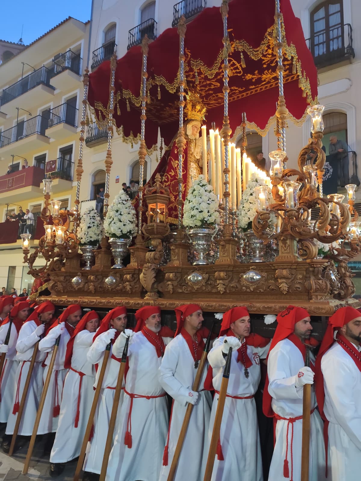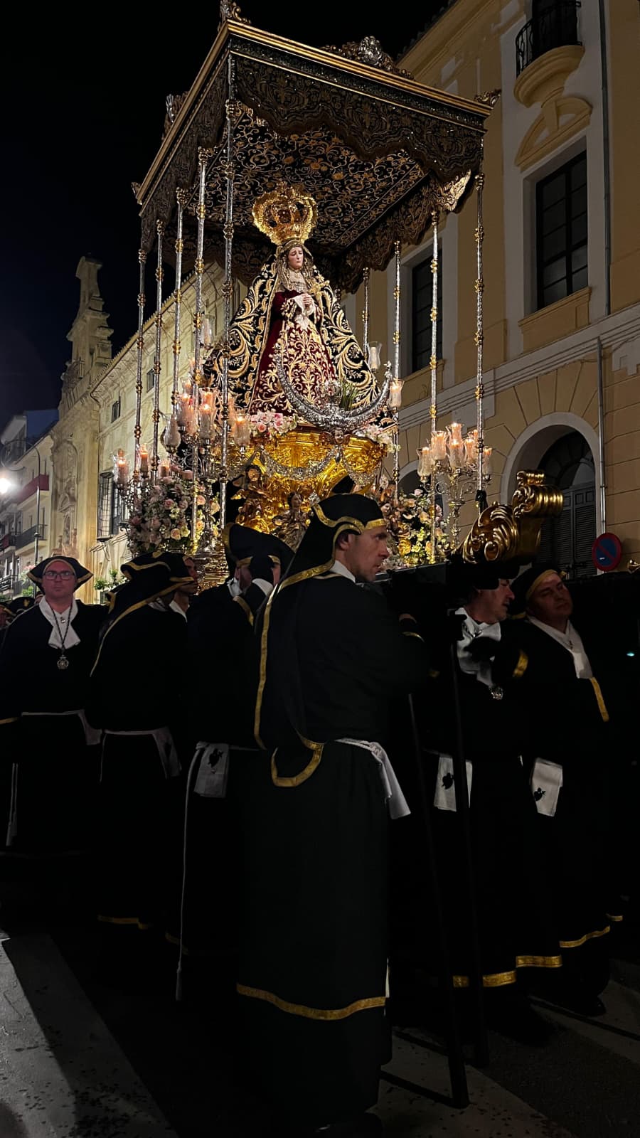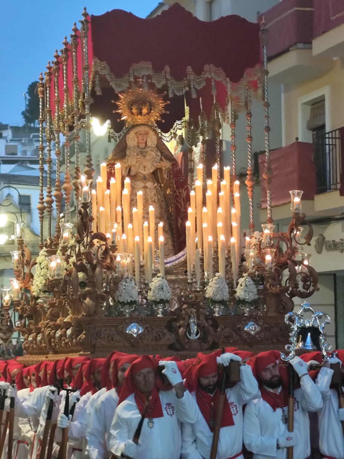 La Virgen de los Dolores Coronada, con Francisco José González Carbonero como Hermano Mayor de Insignia, cerró el cortejo con la novedad de mayor carga simbólica de la noche. Las palmizas de plata portaron por primera vez reliquias de la Madre Carmen, el Beato Enrique Vidaurreta y el Beato Tiburcio Arnais, tres nombres que conectan la imagen con una historia devocional que desborda los límites de Antequera.