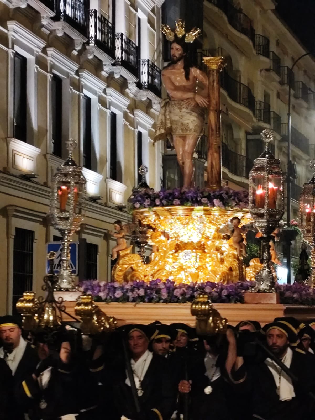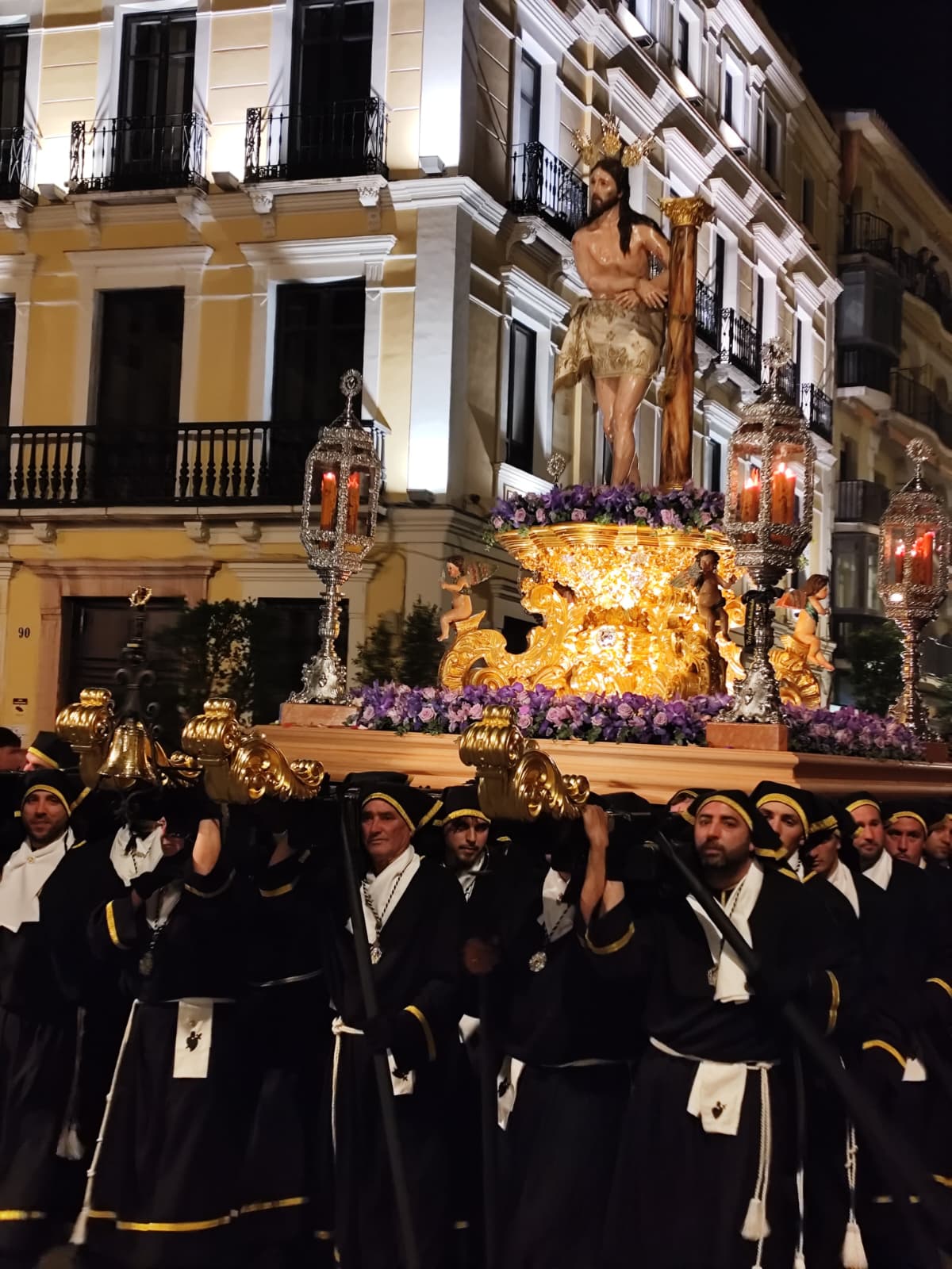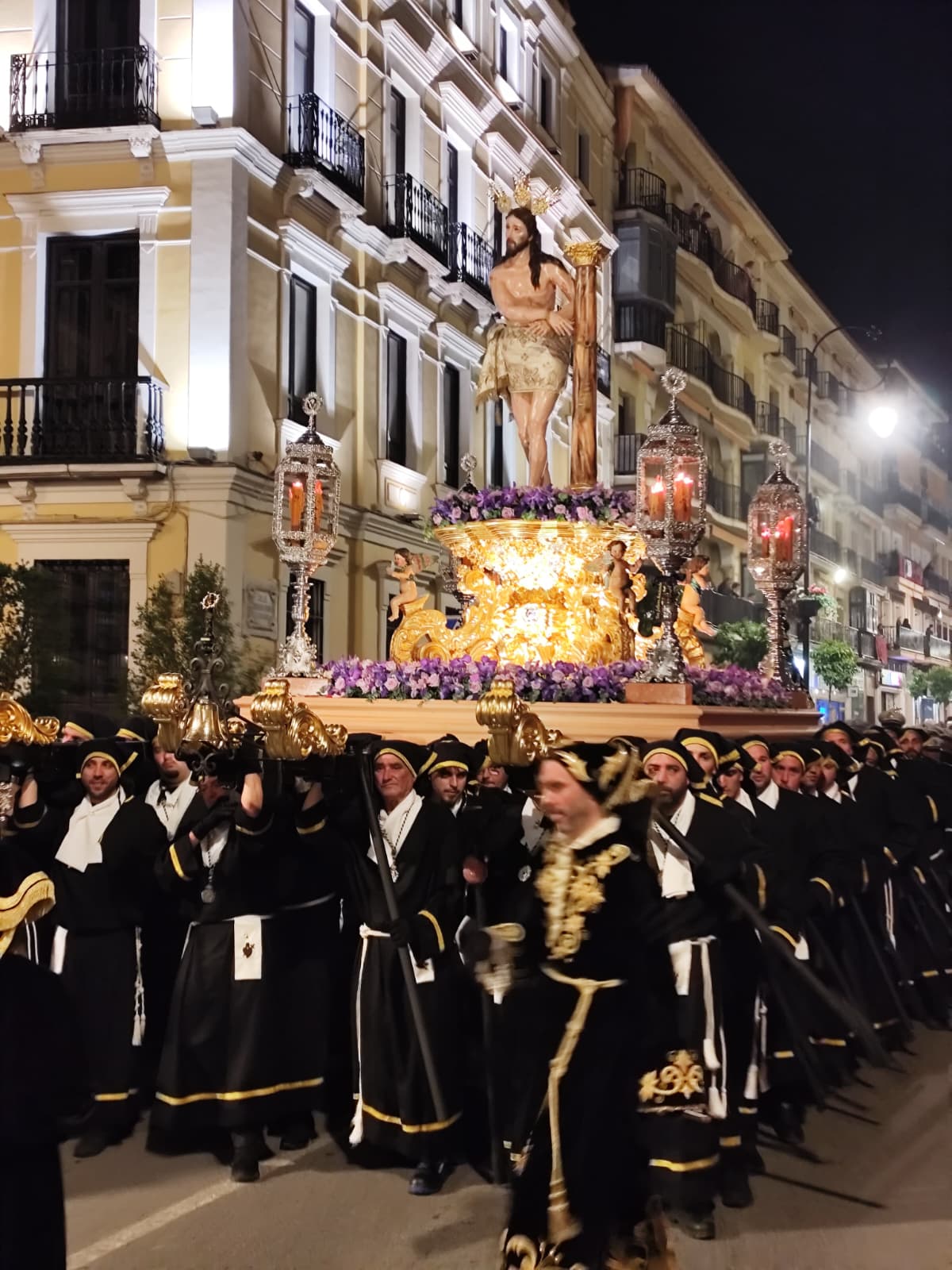 Los tres pasos llegaron a la calle con modificaciones que sus devotos llevan meses esperando. El trono del Señor Atado a la Columna, cuyo Hermano Mayor de Insignia es Juan Antonio Moreno Perea, recuperó la estructura metálica del antiguo trono del Señor Caído, al que se añadieron molduras doradas en oro fino, base de mármol rojo torcal y bordes negros, consiguiendo un resultado que actualiza la estética del paso sin romper con lo que siempre fue.
