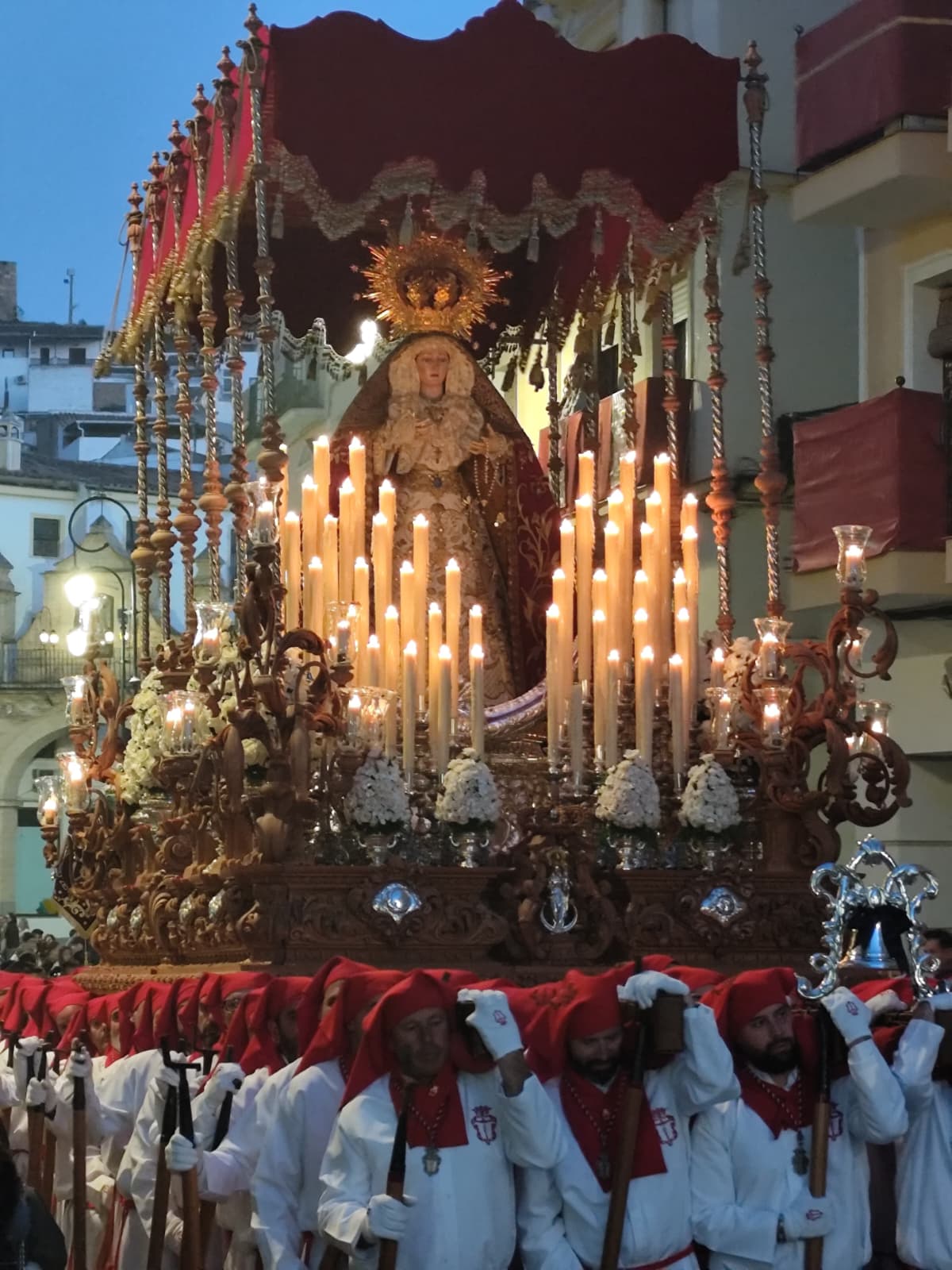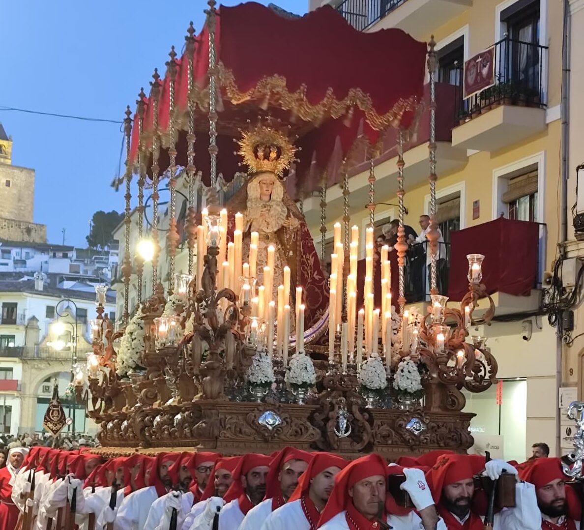 Este año, el trono de Nuestra Señora del Consuelo llegó a la calle con novedades que no pasaron desapercibidas para quienes conocen cada detalle del paso. La culminación del trono procesional —baquetón y hornacinas— completó un diseño de Javier Sánchez de los Reyes ejecutado por el tallista Manuel Toledano, cerrando así un proyecto que llevaba tiempo tomando forma y que esta noche se presentó ante los fieles en su versión definitiva.