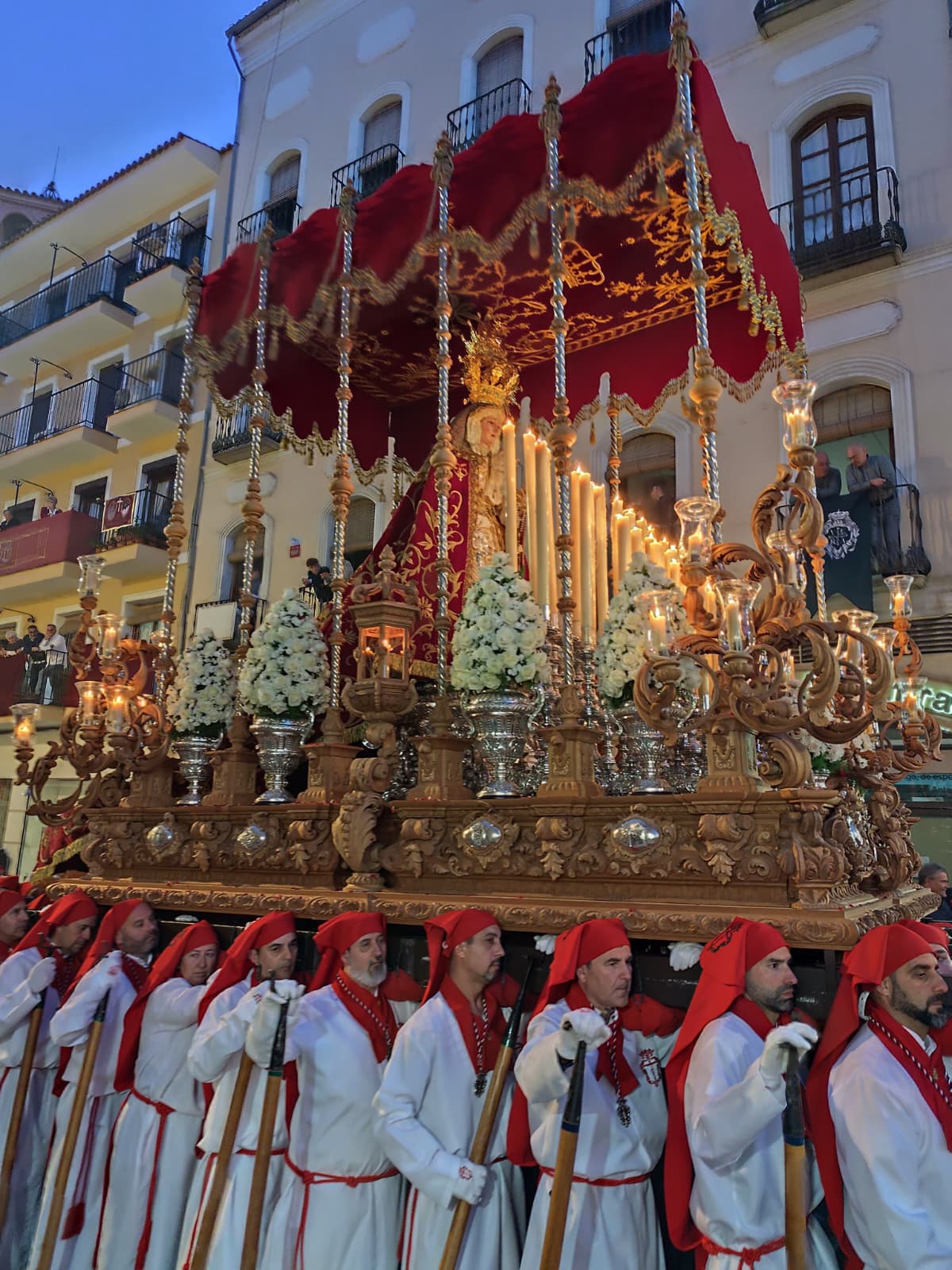 El itinerario de los Servitas recorrió San Pedro, Madre de Dios, San Agustín, San Luis y Calzada antes de subir por la Carrera de Madre Carmen y bajar por la Vega hacia el encierro. Fue precisamente en ese último tramo donde los hermanacos de los Dolores cumplieron con una de las citas más antiguas del Jueves Santo antequerano: correr la vega, llevar los tronos a paso ligero cuesta arriba para que las imágenes bendijeran, como llevan haciendo desde el siglo XVI, los campos que rodean la ciudad.