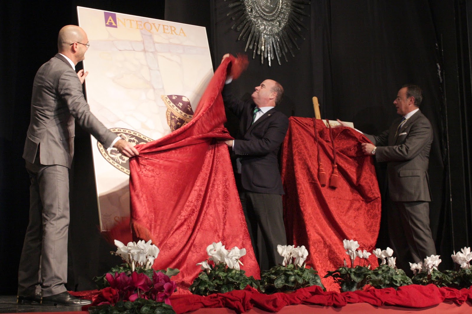 En la noche del viernes el Teatro Torcal de Antequera volvió a ser testigo de la presentación del cartel de Semana Santa. Eran cerca de las diez de la noche cuando el autor, Antonio Castillo, el presentador, Juan Manuel González, y el alcalde de la ciudad, Manolo Barón, descubrieron la imagen.