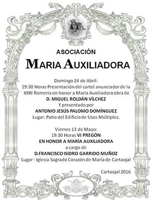 El próximo Domingo a las siete y media de la tarde tendrá lugar la presentación del cartel de la vigésimo tercera Romeria en Honor a Maria Auxiliadora realizado por el pintor Miguel Roldan Vilchez.