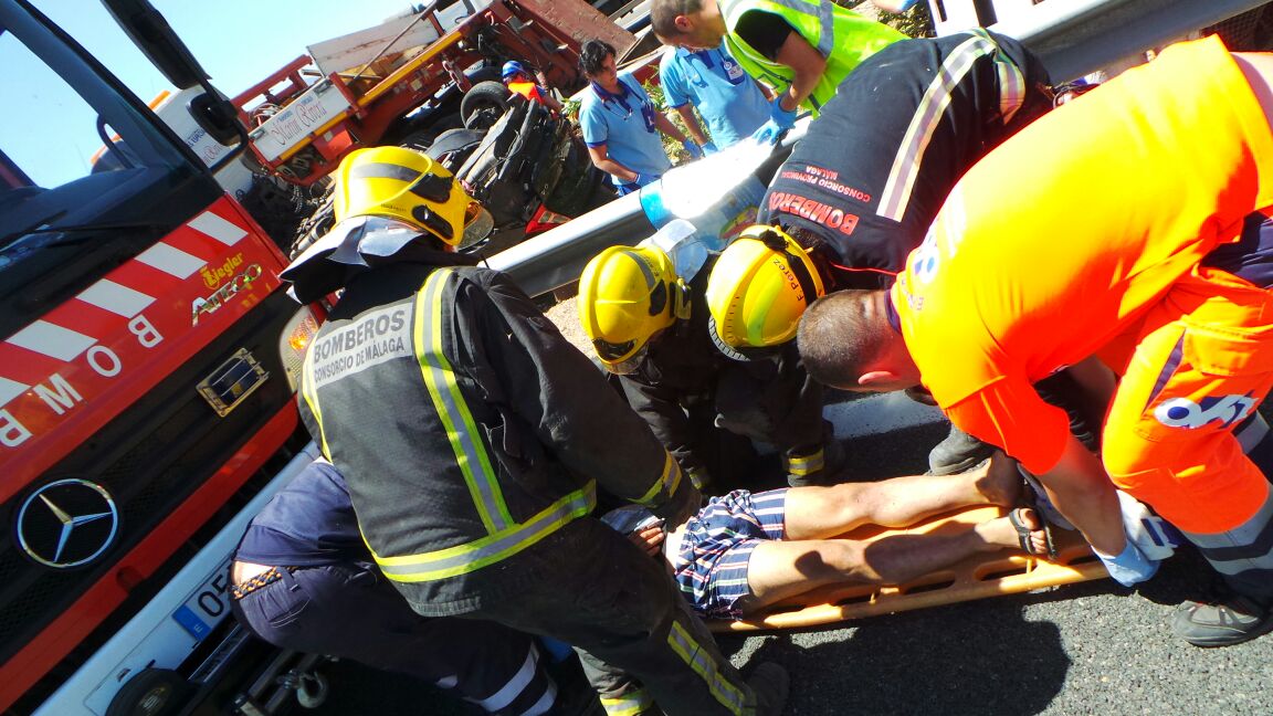 En turismo circulaban cuatro personas, de las que dos han resultado heridas. Uno ha sido trasladado en una ambulancia al hospital de Antequera y el otro, en un helicóptero del 061. Además de estabilizar el vehículo y ayudar en la extracción de los heridos con una camilla, efectivos del Consorcio Provincial de Bomberos (CPB), que han llegado al lugar del suceso a las 12.30 horas, han realizado labores de prevención, ya que había una gran mancha de gasoil en la calzada.