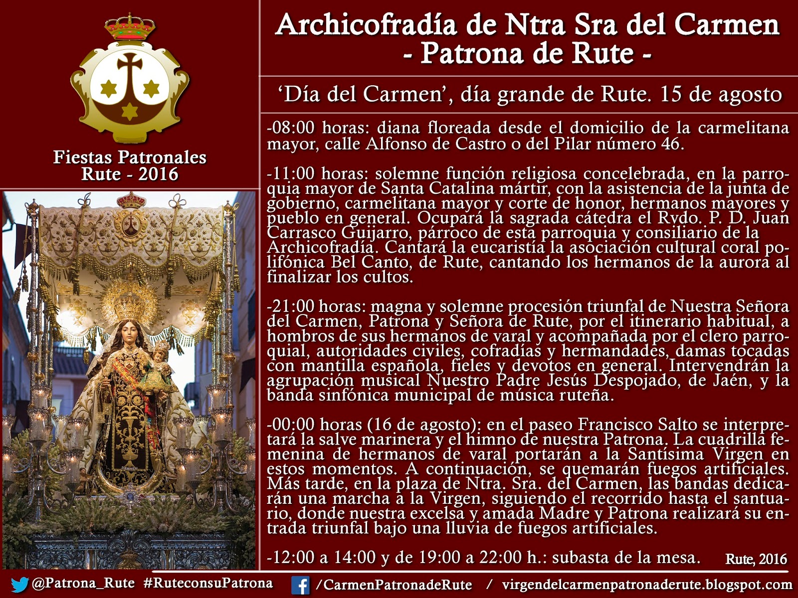 Por la noche, a las 21.00 horas, dará comienzo la Solemne Procesión Patronal que saldrá desde la Parroquia Mayor de Santa Catalina Martír ubicada en Calle Constitución y recorrerá dicha vía urbana, Alfonso de Castro, Callejuela de Salera, Francisco Salto, Del Señor, Plaza de Nuestra Señora de la Cabeza, Colón, Fresno, Del Cerro, Andalucía, Parque de Nuestra Señora del Carmen Patrona de Rute, Juan Carlos I Rey de España, Plaza de Nuestra Señora del Carmen, Calle Toledo, y está previsto que en torno a las 2.00 horas, la Sagrada Protectora de la localidad ruteña entre a su Santuario ubicado en calle Toledo, número 31.