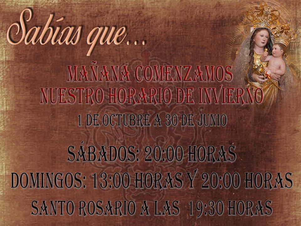 Desde el pasado 1 de octubre cambia el horario de misa y rosario en la Iglesia de Los Remedios, Santuario de la Patrona de Antequera. Siendo hasta el próximo 30 de Juniom la celebración de la Eucaristia los sábados a las 20.00 horas, y los domingos a las 13.00 y 20.00 horas.