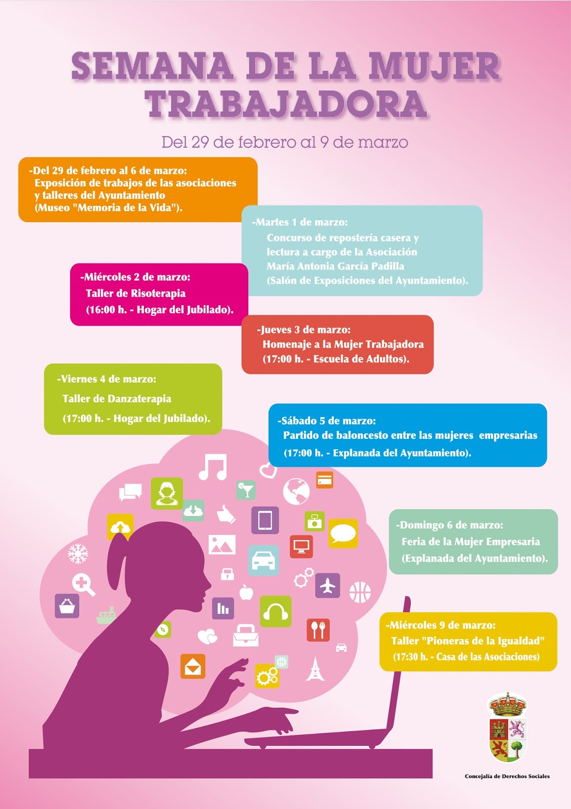 Los actos comienzan esta tarde, con el inicio de la ‘Semana de la Mujer Trabajadora’, que se estrena inaugurando varias exposiciones de pintura, fotografía y manualidades realizadas por las asociaciones y los talleres llevados a cabo por el Ayuntamiento. Será a partir de las 17:00 horas, en el Museo Memoria de la Vida, cuyas muestras se podrán visitar cada tarde hasta las 20:00, mientras que el 6 de marzo lo estará de 11:00 a 18:00 horas.