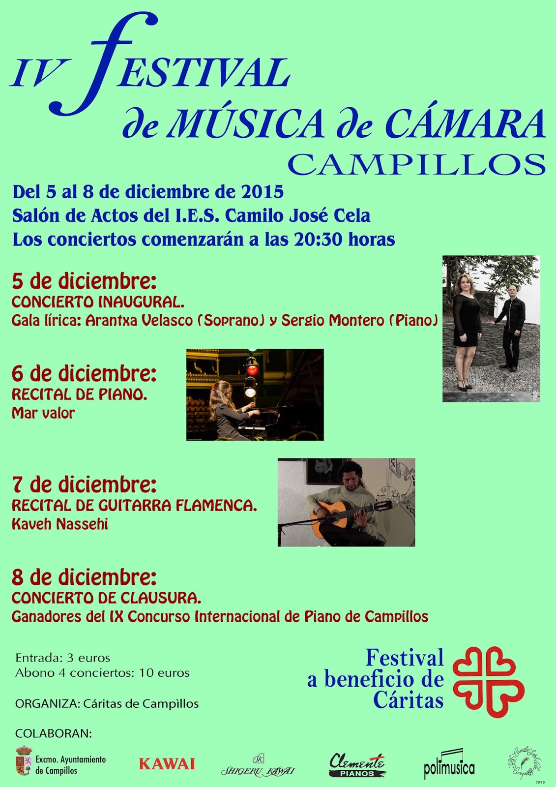 Paralelamente al ‘IX Concurso Internacional de Piano’ el Ayuntamiento de Campillos ha organizado un ‘IV Festival de Música de Cámara‘ cuyos conciertos se celebrarán en el salón de actos del I.E.S. ‘Camilo José Cela’ los días 5, 6, 7 y 8 de diciembre, a las 20:30 horas.