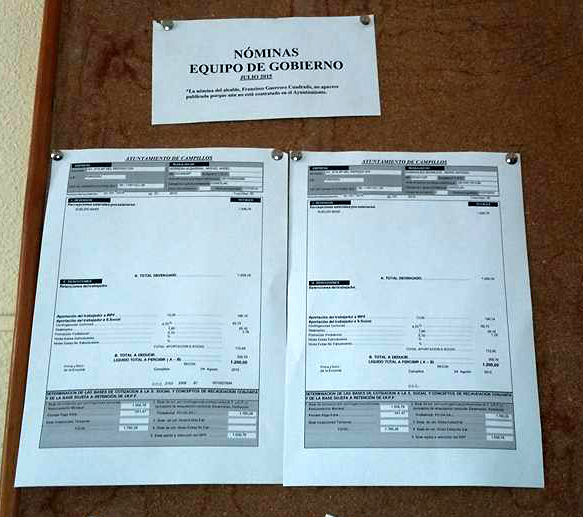 El Ayuntamiento de Campillos estrenó hace unos días el ‘Tablón de la Transparencia’, ubicado en el Registro de Entrada del Consistorio y con el que el equipo de Gobierno quiere informar con detalle de todas las gestiones que se lleven a cabo en materia de empleo. Así, se han expuesto al público para su consulta las nóminas de los integrantes del equipo de Gobierno que perciben retribución económica por su labor política, el estado de las bolsas de trabajo y los contratos temporales realizados desde el 16 de junio en adelante, indicando el proceso, la fecha y la labor a desempeñar por cada persona contratada.
