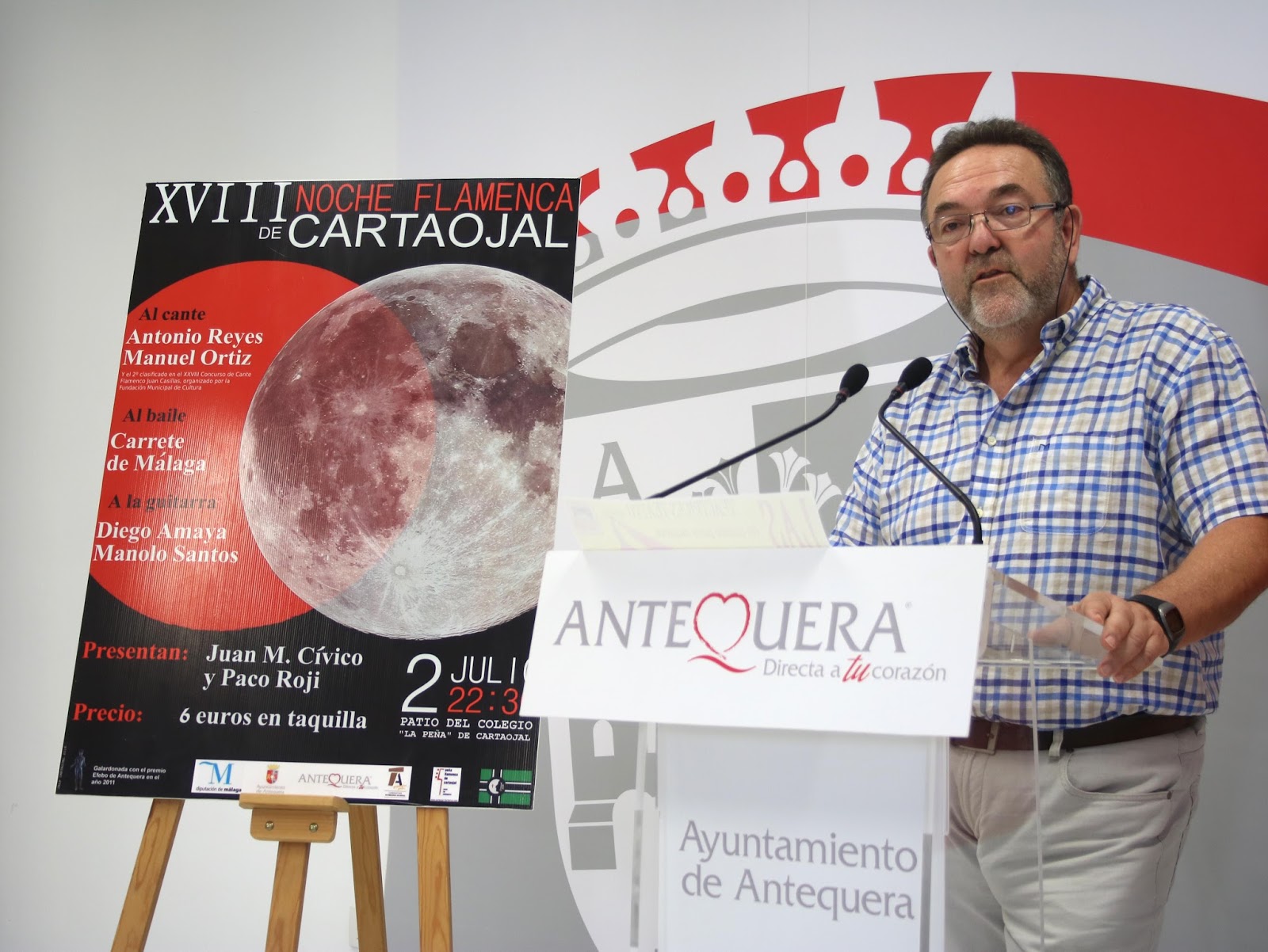 La pedanía de Cartaojal celebra el próximo día dos de julio su XVIII Noche Flamenca. Una cita con la música, organizada por la Peña Flamenca, que tendrá lugar en el Patio del Colegio Público La Peña de Cartaojal y cuya entrada tendrá un precio de seis euros, ha señalado la concejal de Cultura, Ana Cebrián.
