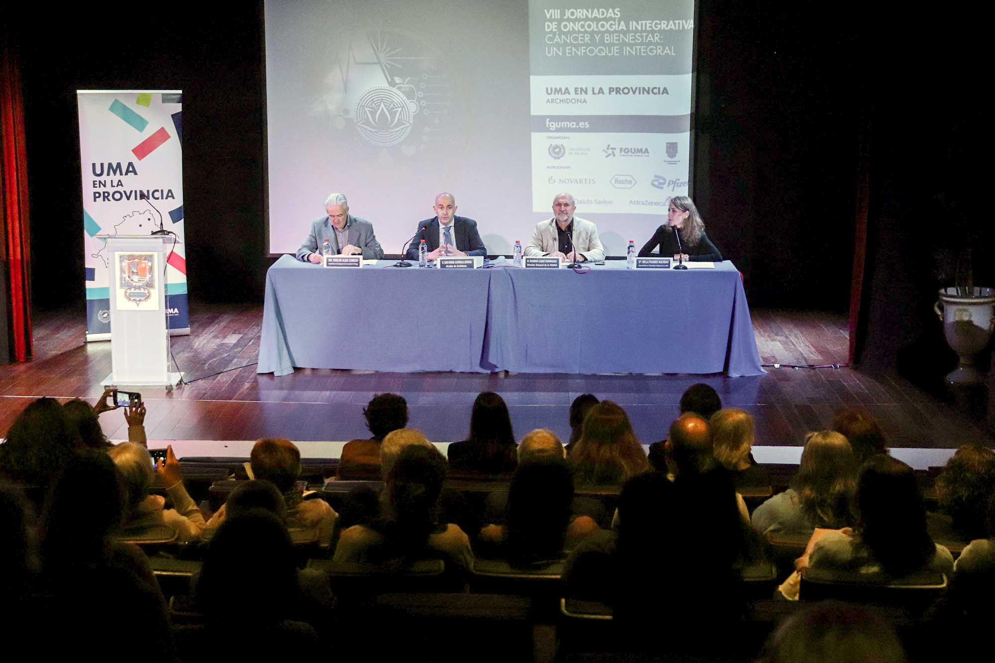 “Cáncer y bienestar: un enfoque integral” es el título de las VIII Jornadas sobre oncología integrativa que se celebran hoy en Archidona. Un programa que está organizado por la Fundación General de la Universidad de Málaga (FGUMA) y el Ayuntamiento del municipio y que forma parte del proyecto “UMA en la provincia”. Esta actividad, con más de 170 asistentes, reúne a profesionales del ámbito de la Medicina que acercan la ciencia con información rigurosa y comprensible tanto a pacientes como a familias para ayudar a cuidar su calidad de vida. En esta edición, coordinada por el prestigioso catedrático de Oncología y referente internacional en la investigación y lucha contra el cáncer, Emilio Alba, y la especialista de la Unidad de Cáncer Hereditario del Hospital Clínico de Málaga Bella Pajares, se cuenta con el patrocinio de Novartis, Roche, Pfizer y AstraZeneca.