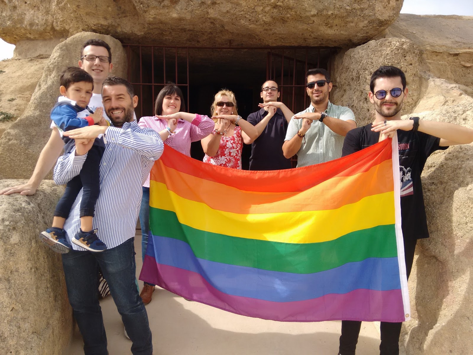 El colectivo de Lesbianas, Gays, Bisexuales y Transexuales Colega Antequera organizó el pasado sábado una jornada de convivencia que comenzó a mediodía con una visita a los Dólmenes de Menga y Viera. Allí, acompañados del concejal de Juventud y Patrimonio Mundial, Juan Rosas, descubrieron dicho Conjunto Arqueólogico, la única candidatura española para los próximos nombramientos en 2016 de Patrimonios de la Humanidad por la Unesco. Así, la organización mostró su apoyo realizando el gesto en lengua de signos, así como portando la bandera multicolor.