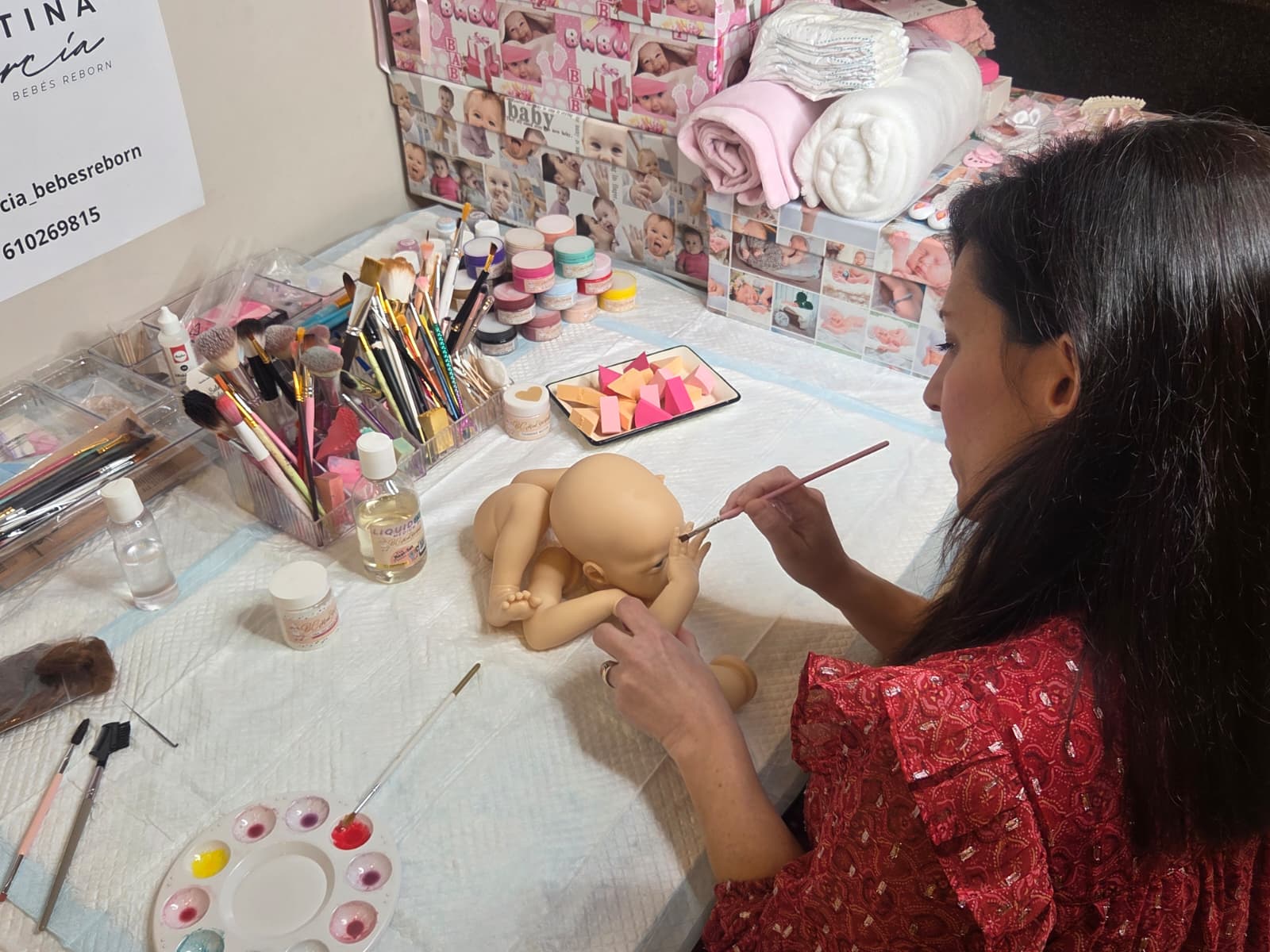 Cada bebé reborn comienza como una escultura en blanco, creada por artistas especializados y, en muchos casos, en ediciones limitadas. A partir de ahí, Cristina aplica alrededor de dieciséis capas de pintura para recrear la piel, las venas, los pliegues, las rojeces o pequeñas imperfecciones que hacen que cada pieza sea única. El pelo, pintado en 3D o injertado pelo a pelo según el encargo, es uno de los aspectos que más sorprende a quienes se acercan por primera vez a su taller.