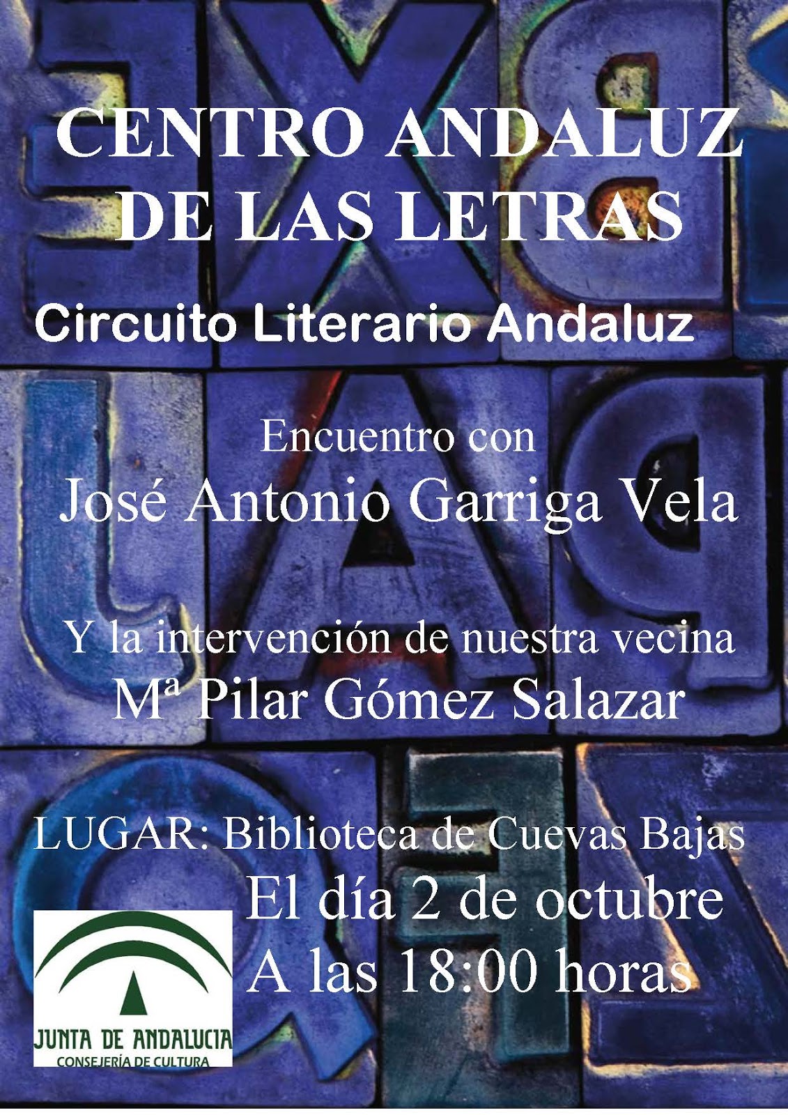 La biblioteca de Cuevas Bajas acoge el viernes 2 de octubre, a partir de las seis de la tarde, un encuentro con el escritor José Antonio Garriga Vela, como parte del Circuito Literario Andaluz del Centro Andaluz de las Letras dependiente de la Consejería de Cultura.