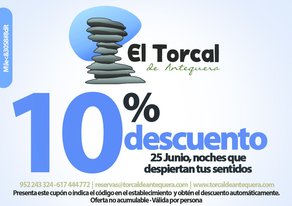 Inactivos [CUPÓN] 10% de descuento el 25 de junio en noches que despiertan tus sentidos en El Torcal Por Redacción Las 4 Esquinas - 21 de junio de 2016 3 106 FacebookTwitterPinterestWhatsApp Enseña este cupón imprimiéndolo o directamente desde tu móvil en el establecimiento. Estamos en Calle Carrera, 43 en Antequera, teléfono 699 35 71 11 PUBLICIDAD