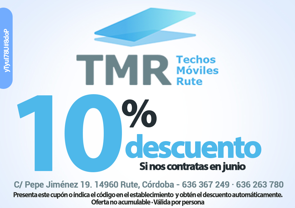Inactivos [CUPÓN] 10% de descuento si contratas los servicios de Techos Móviles Rute en junio Por Redacción Las 4 Esquinas - 26 de mayo de 2016 0 148 FacebookTwitterPinterestWhatsApp Enseña este cupón imprimiéndolo o directamente desde tu móvil en el establecimiento. Están en Calle Pepe Jiménez, 19 en Rute, teléfono 636 36 72 49 / 636 26 37 80 PUBLICIDAD