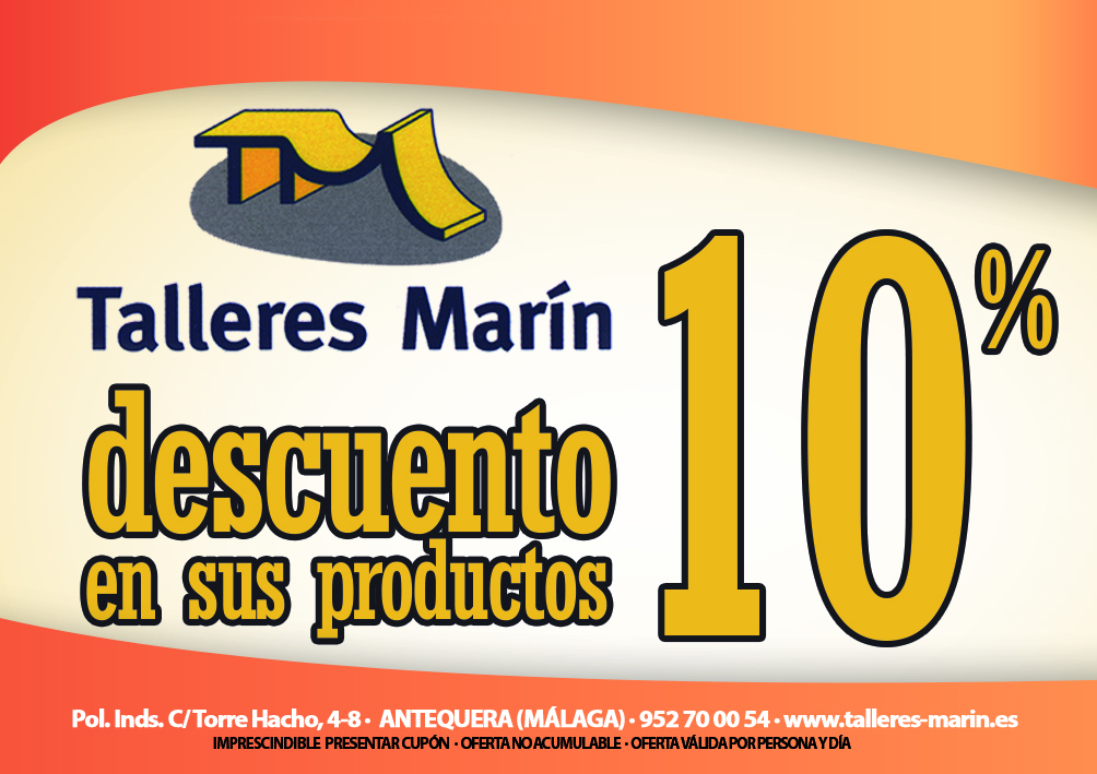 Inactivos [CUPÓN] 10% dto. en tus productos en Talleres Marín Por Redacción Las 4 Esquinas - 17 de septiembre de 2015 2 120 FacebookTwitterPinterestWhatsApp Consigue un 10% de descuento en los productos de Talleres Marín. Enseña este cupón imprimiéndolo o directamente desde tu móvil en el establecimiento. Están en Pol. Inds. C/Torre Hacho, 4-8, Teléfono: 952 70 00 54 PUBLICIDAD