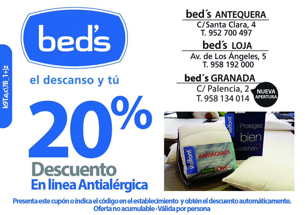 Inactivos [CUPÓN] 20% de descuento en linea Antialérgica en Tiendas Beds Por Redacción Las 4 Esquinas - 15 de marzo de 2016 2 169 FacebookTwitterPinterestWhatsApp Enseña este cupón imprimiéndolo o directamente desde tu móvil en el establecimiento. Están Calle Santa Clara, 4 en Antequera, teléfono 952 72 04 97 PUBLICIDAD
