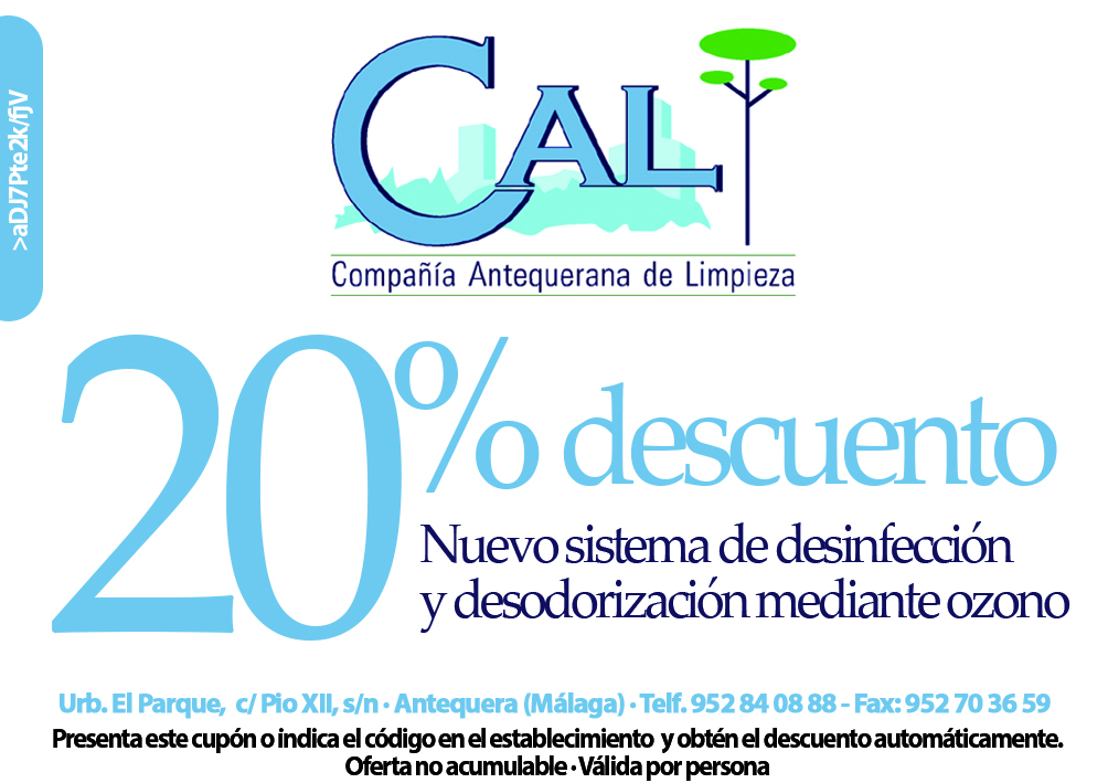 Inactivos [CUPÓN] 20% de descuento en nuevo sistema de desinfección y desodorización mediante ozono en CAL Por Redacción Las 4 Esquinas - 15 de marzo de 2016 1 71 FacebookTwitterPinterestWhatsApp Enseña este cupón imprimiéndolo o directamente desde tu móvil en el establecimiento. Puedes encontrarlos en Urbanización El Parque, entrada por C/ Pio XII; 29200 Antequera. Teléfono: 952 84 08 88 PUBLICIDAD