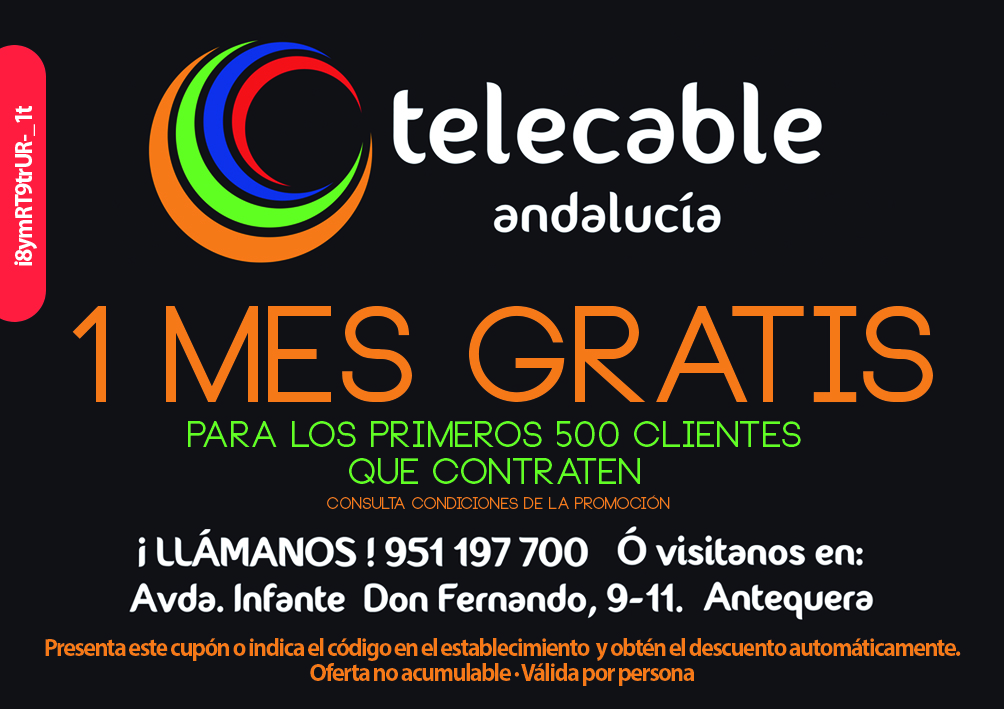 Inactivos [CUPÓN] Un mes gratis para los primeros 500 clientes que contraten en Telecable Andalucía Por Redacción Las 4 Esquinas - 21 de junio de 2016 0 150 FacebookTwitterPinterestWhatsApp Enseña este cupón imprimiéndolo o directamente desde tu móvil en el establecimiento. Estamos en Calle Infante Don Fernando 9-11 en Antequera, teléfono 951 19 77 00 PUBLICIDAD