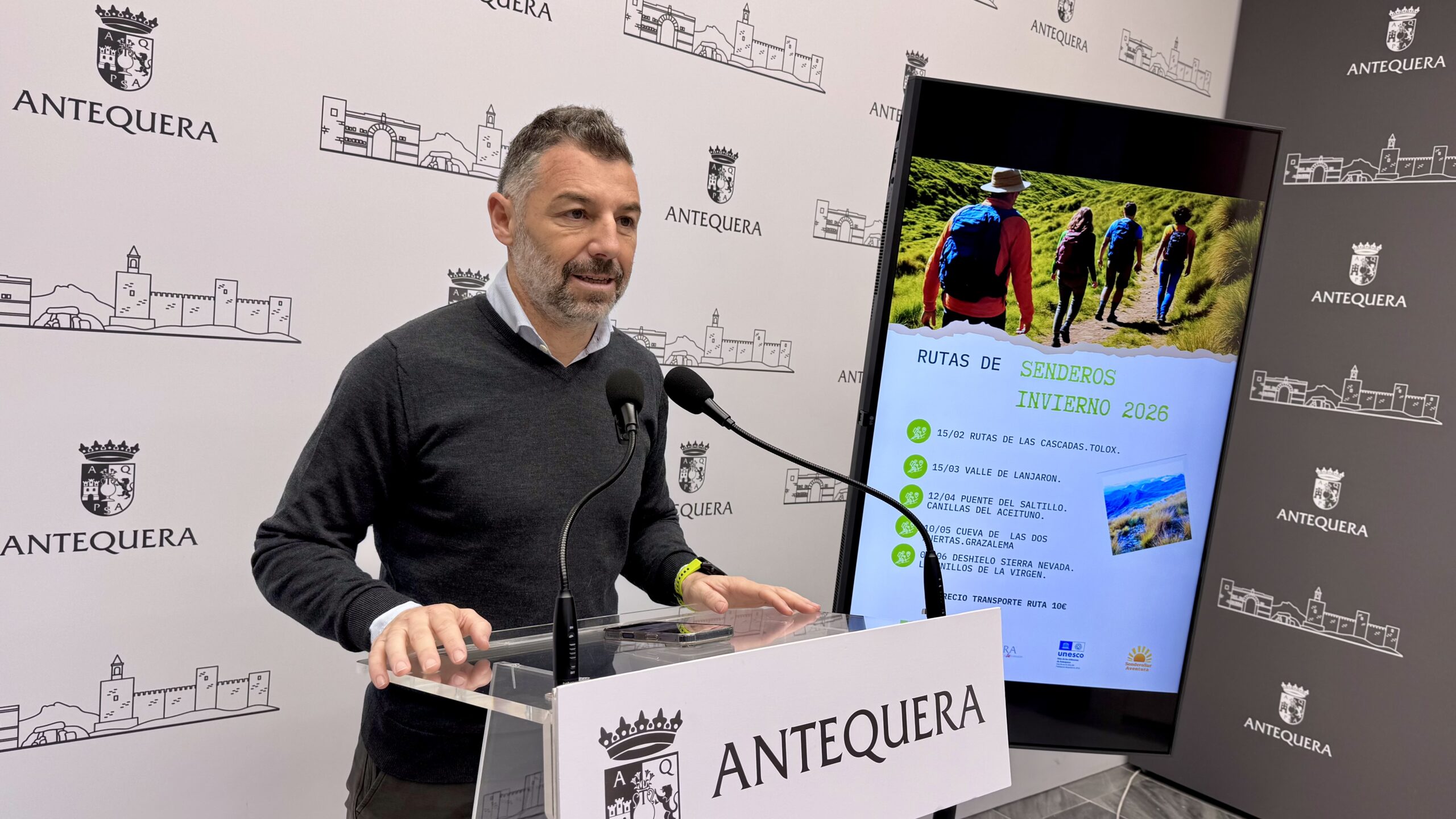 El teniente de alcalde y responsable del Área de Deportes, Juan Rosas, ha anunciado hoy en rueda de prensa el lanzamiento del programa de Rutas de Senderos de Invierno 2026. Esta propuesta, desarrollada junto a Sendero Sur Aventura, invita a los antequeranos a explorar algunos de los parajes más impresionantes de Andalucía entre los meses de febrero y junio.