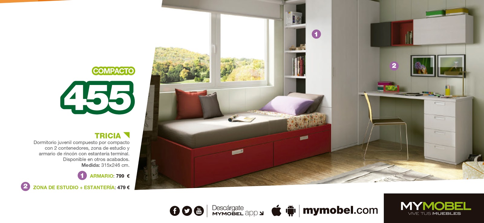 Inactivos Dormitorio juvenil compuesto por cama, zona de estudio ,armario de rincón con estantería desde 455 € en My Mobel Antequera Por Redacción Las 4 Esquinas - 19 de septiembre de 2016 1 143 FacebookTwitterPinterestWhatsApp Dormitorio juvenil compuesto por compacto con 2 contenedores, zona de estudio y armario de rincón con estantería terminal. Disponible en otros acabados. Armario: 799 € Zona de estudio + Estantería: 479 € PUBLICIDAD