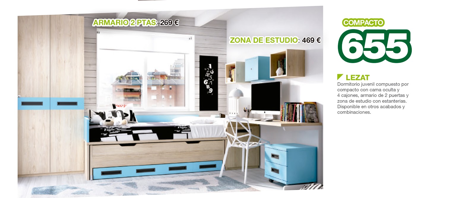 Inactivos Dormitorio juvenil compuesto por compacto con cama oculta, armario y zona de estudio desde 655 € en MyMobel Antequera Por Redacción Las 4 Esquinas - 7 de septiembre de 2016 1 159 FacebookTwitterPinterestWhatsApp Dormitorio juvenil compuesto por compacto con cama oculta y 4 cajones, armario de 2 puertas y zona de estudio con estanterías. Disponible en otros acabados y combinaciones. PUBLICIDAD