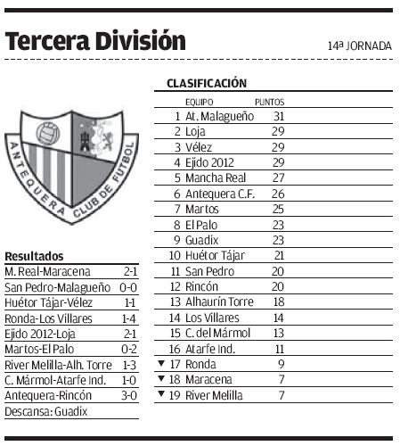 El Antequera C.F. mantiene sus opciones de optar al play off intactas tras una victoria de 3 – 0 frente a El Rincón que se supo defender muy bien frente al equipo local hasta la segunda parte en la que el Antequera anotó los tres tantos que le darían la victoria y se colocan en 6ª Posición y a tan solo tres puntos de el 2º clasificado