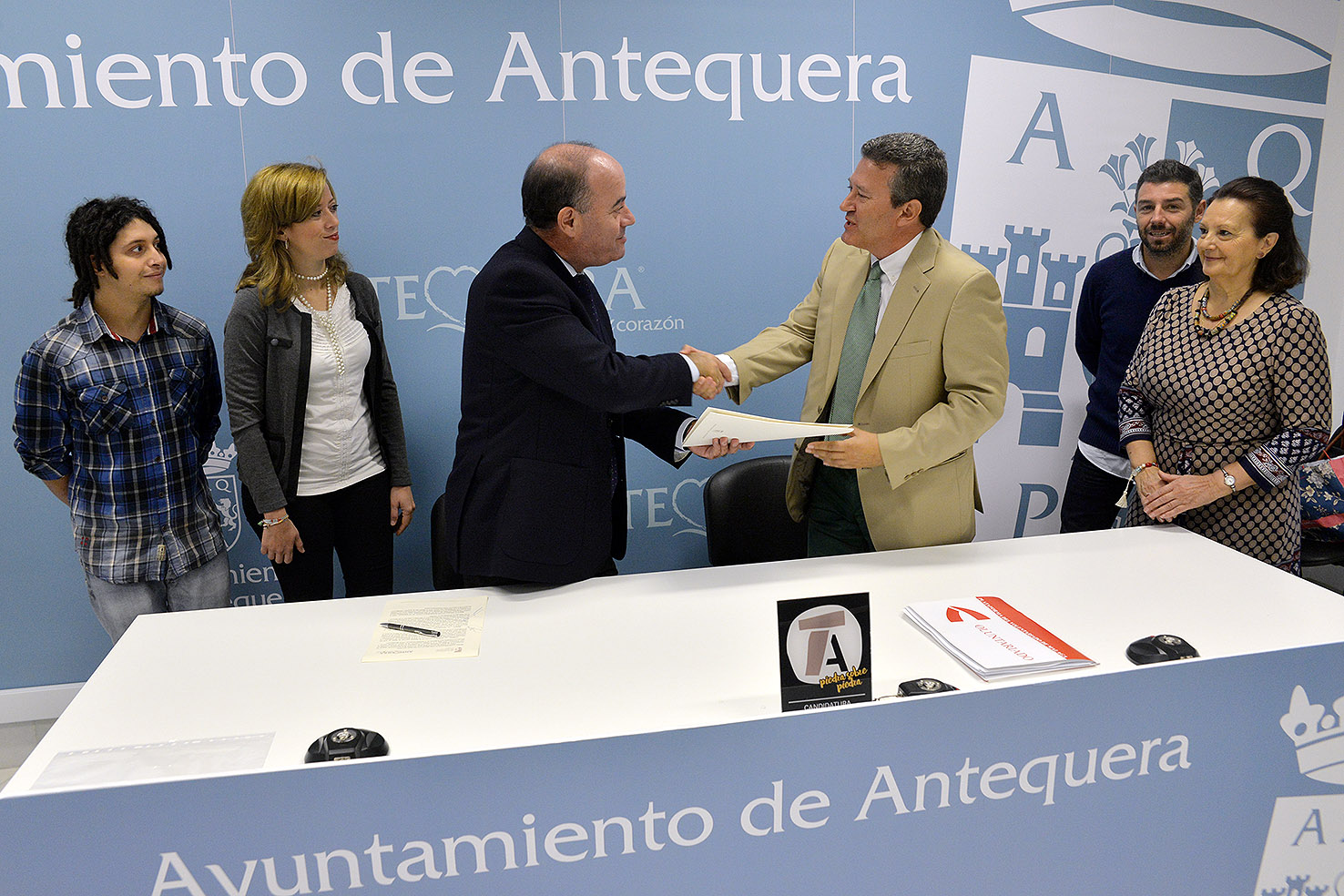 El alcalde de Antequera, Manolo Barón, y el presidente de la Plataforma del Voluntariado de la Comarca de Antequera, Alejo Parejo, han firmado un nuevo convenio de colaboración entre ambas instituciones que conlleva la cesión de un espacio en la Casa de la Juventud que se configurará como punto de información de dicho colectivo.