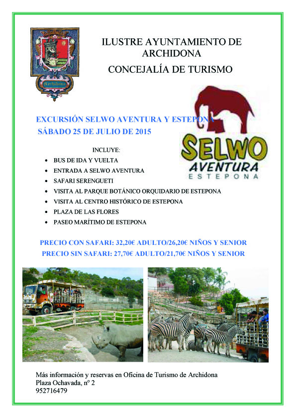 La Concejalía de Turismo del Ayuntamiento de Archidona organiza una excursión a Selvo Aventura y a Estepona el próximo sábado 25 de julio.