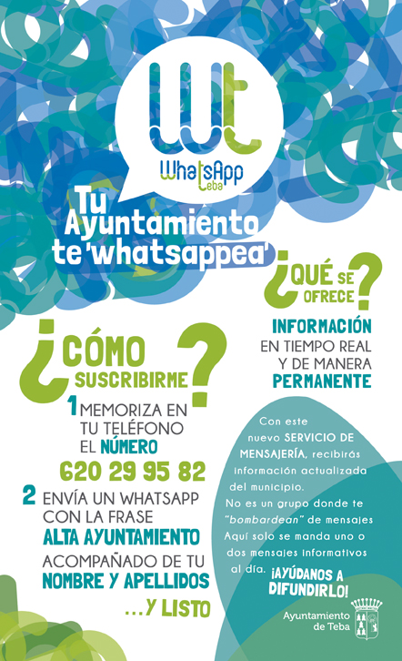 Para recibir información municipal en el móvil vía WhatsApp, los interesados tendrán que seguir unos sencillos pasos para contar con el servicio de manera gratuita: memorizar en el teléfono móvil el número 620 29 95 82 y enviar un mensaje con la frase ALTA AYUNTAMIENTO acompañada de NOMBRE y APELLIDOS. Periódicamente los suscritos recibirán las noticias más interesantes de Teba en el móvil.