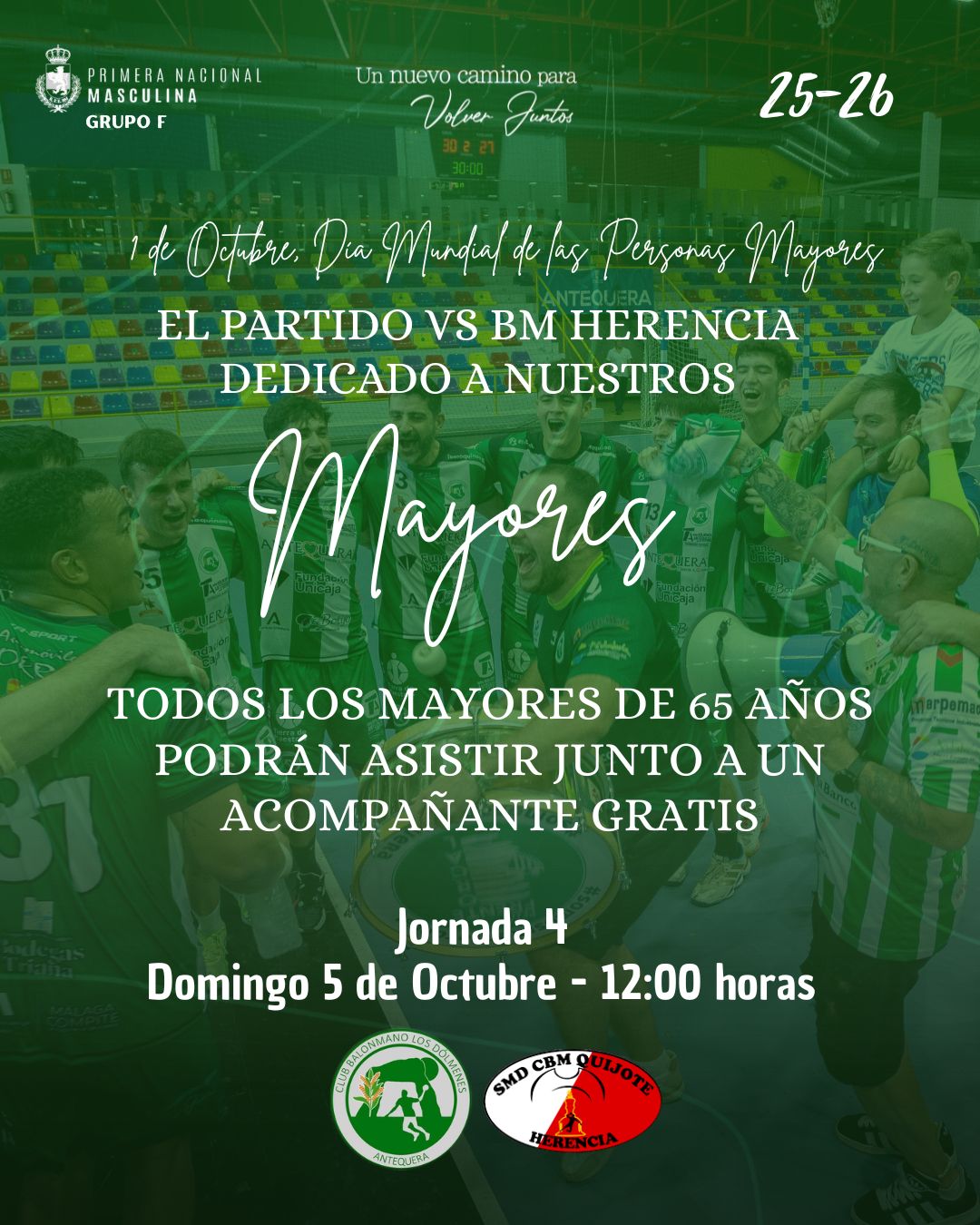 El equipo antequerano afrontará la jornada 4 de la Primera División Nacional (Grupo F), en el que medirá fuerzas ante el Balonmano Herencia. Una ocasión inmejorable para que nuestros mayores puedan disfrutar de un evento deportivo y del gran ambiente que se vive en las gradas sin coste alguno.