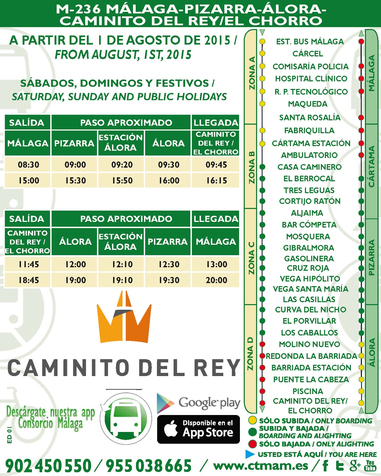Ir a conocer el Caminito del Rey ya es más fácil gracias a que el Consorcio de Transporte ha puesto en servicio la nueva ruta M-236 Málaga-Pizarra-Álora-Caminito del Rey/El Chorro, que empezará a ofrecer su servicio a partir de mañana, 1 de agosto. Esta línea tendrá dos expediciones completas los sábados, domingos y festivos (siempre que no sean lunes), con salidas a las 08:30 y 15:00 horas desde Málaga, y a las 11:45 y 18:45 horas desde Caminito del Rey/El chorro.