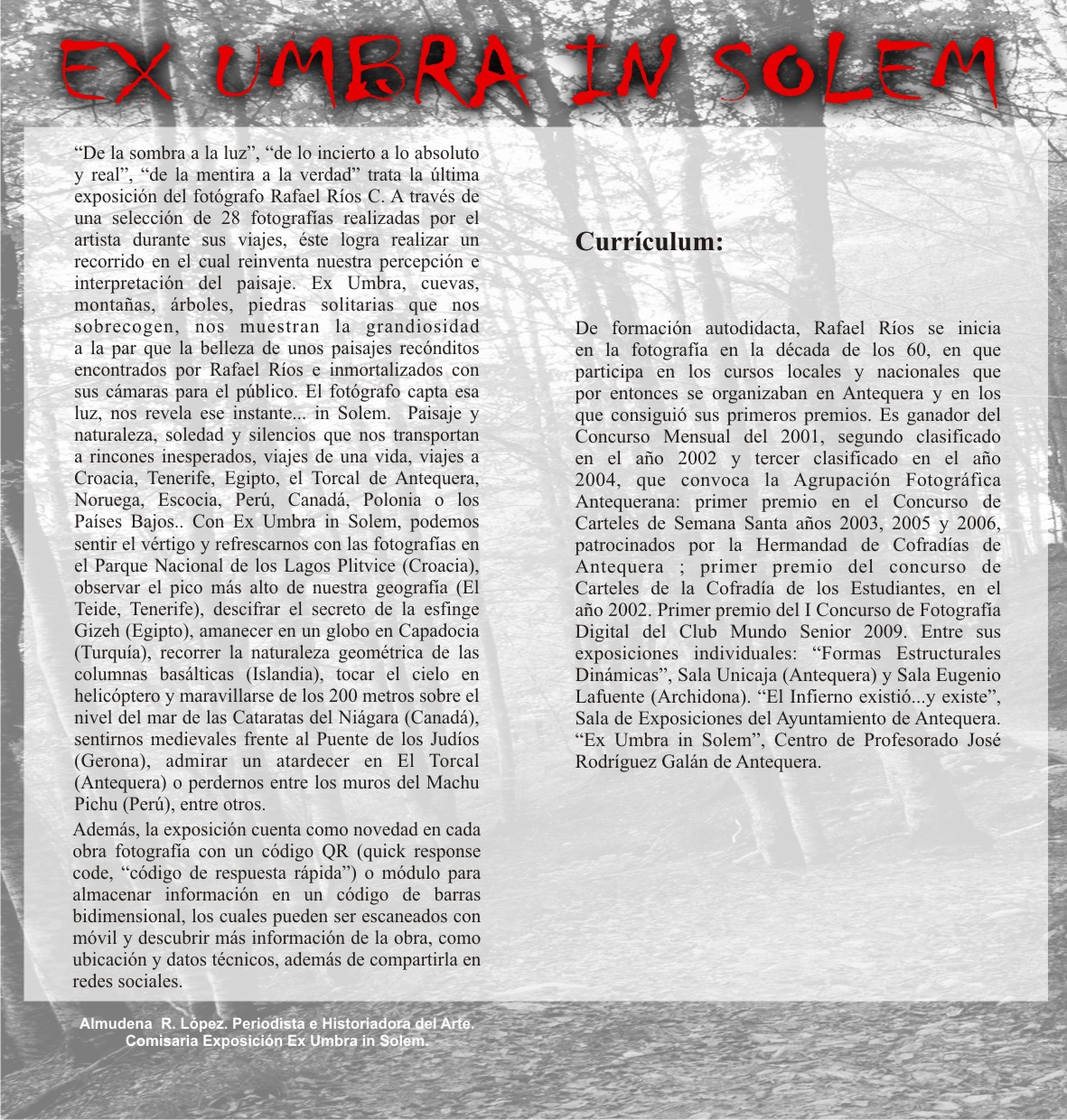 Ex Umbra, cuevas, montañas, árboles, piedras solitarias que nos sobrecogen, nos muestran la grandiosidad a la par que la belleza de unos paisajes recónditos encontrados por Rafael Ríos e inmortalizados con sus cámaras para el público, el fotógrafo capta esa luz, nos revela ese instante… in Solem.