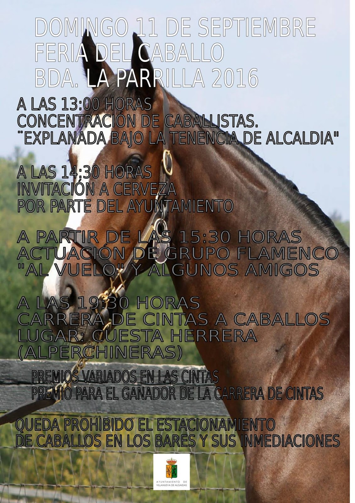 El domingo 11 de septiembre será celebrada en la barriada La Parrilla de Villanueva de Algaidas la Feria del Caballo 2016. Comenzará a las 13:00 h. con la concentración de caballistas en la explanada bajo la tenencia de alcaldía.