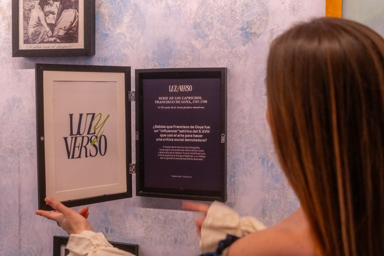 La visita comienza en la zona exterior del recinto, que sirve de introducción al universo de ‘Luz y Verso’ con dos espacios: el taller del artista, una recreación del estudio de un pintor con obras animadas y cuestionarios creativos, y un stand en el que los visitantes pueden conseguir un retrato de época realizado con Inteligencia Artificial e inspirado en el estilo de los grandes maestros.