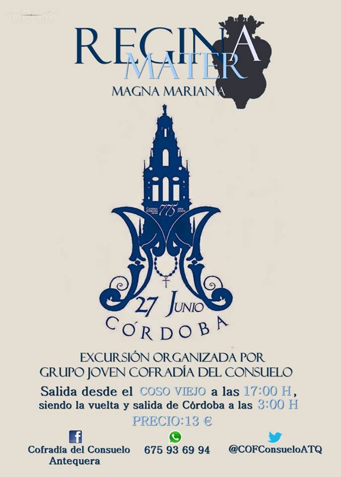El Grupo Joven de la Cofradia del Consuelo de Antequera organiza excursión a la Magna Mariana Regina Mater, que tendrá lugar este sábado 27 de Junio en Córdoba. El precio del viaje es 13 euros y se saldrá de Antequera del Coso Viejo a las 5 de la tarde regresando de Córdoba a las 3 de la madrugada.