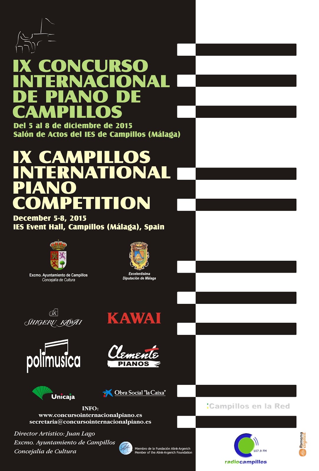 No se admitirá la participación a los ganadores del Primer Premio de las ediciones anteriores y a alumnos oficiales o privados de los miembros del jurado en la actualidad o con una anterioridad de hasta dos años. Este ‘IX Concurso Internacional de Piano de Campillos’ cuenta con el patrocinio y la colaboración de Kawai, Shigeru Kawai, Clemente Pianos, Polimúsica, Diputación Provincial de Málaga, Unicaja, La Caixa y un buen número de empresas y comercios locales.