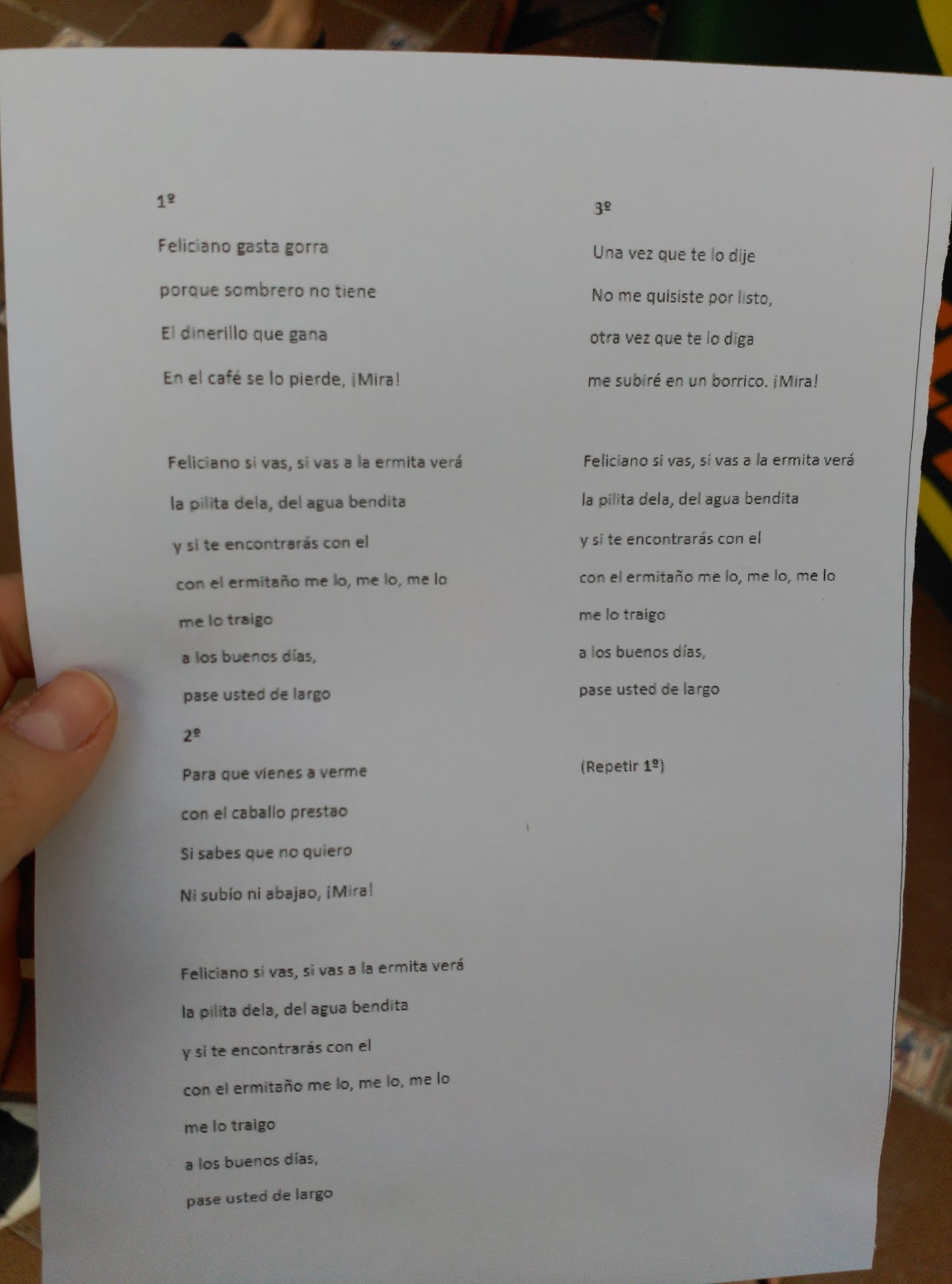 No cabe duda de que cocinar este tradicional plato a golpe de mortero es arduo, pero el trabajo se hace más ameno si se hace cantando: “Feliciano gasta porra, porque sombrero no tiene. El dinerillo que gana, en el café se lo pierde, ¡Mira! Feliciano si vas, si vas a la ermita verá la pilita del agua bendita…”.