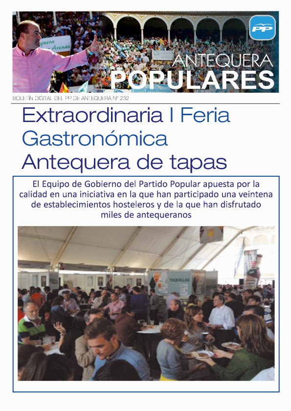 Artículos de OpiniónArtículos de PolíticosSocial El Partido Popular dedica hoy su boletín a la celebración de la feria ‘Antequera de Tapas’ Por Redacción Las 4 Esquinas - 30 de septiembre de 2013 0 304 FacebookTwitterPinterestWhatsApp PUBLICIDAD