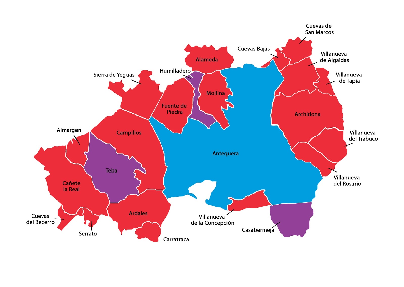 Precisamente los resultados de la cabecera de la Comarca provocaron que la distancia entre socialistas y populares no fuera más allá. Sumados todos los municipios el PSOE aventajó finalmente al PP en algo menos de 12 puntos. Sin embargo, excluyendo Antequera la diferencia se acercaría a los 20 puntos. Así, por ejemplo, analizando los resultados de Alameda, Casabermeja, Humilladero, Fuente de Piedra, Mollina y Villanueva de la Concepción, se puede comprobar como el primer partido logró un total de 4.621 votos, mientras que la lista popular se quedó en los 2.780. Esta diferencia también se hace notar en el conjunto de las localidades de Guadalteba (6.258 – 3.251) o Nororma (7.167 – 3.371).