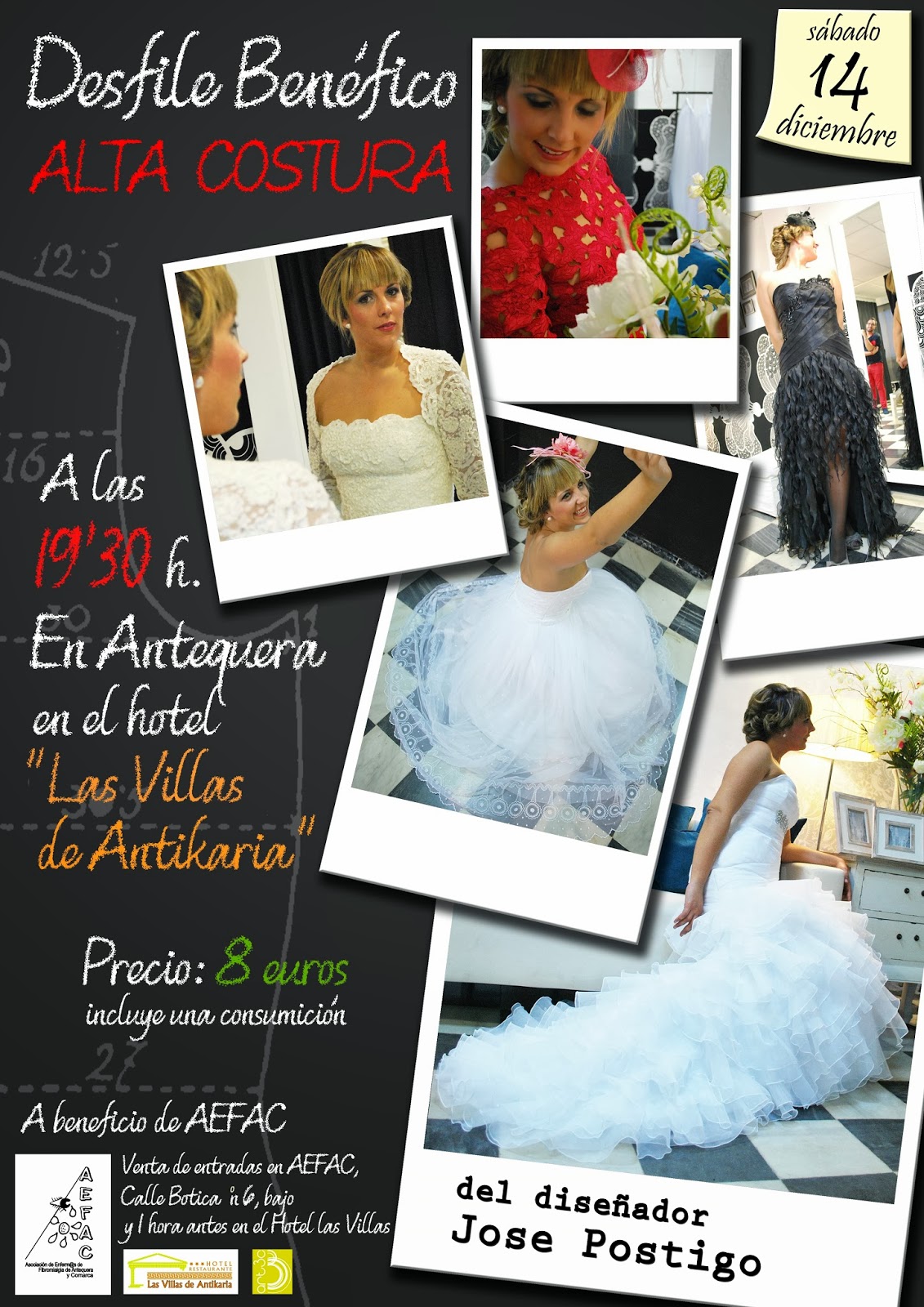 Desde la Asociación de Fibromialgia de Antequera y Comarca han comunicado que el próximo 14 de Diciembre tendrá lugar el segundo Desfile Benéfico de Alta Costura en el hotel las Villas de Antikaria del diseñador José Postigo. Con importantes novedades y grandes sorpresas. El objetivo de esta actividad es el mantenimiento del programa de rehabilitación física que realizan estas enfermas. El desfile es a las siete y media de la tarde con un precio de ocho euros e incluye una consumición. Las entradas se venden en calle Bótica 6 y en el Hotel Las Villas.