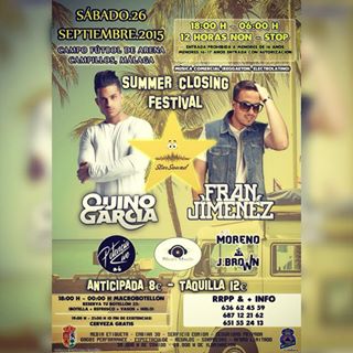 El campo municipal de fútbol de albero de Campillos acoge este sábado 26 de septiembre el ‘Summer Closing Festival’, que dará comienzo a las cinco de la tarde y se prolongará de forma ininterrumpida hasta las cinco de la mañana del domingo. Los asistentes gozarán de 12 horas de festival con el reggaeton como principal protagonista. El precio de las entradas es de ocho euros si se adquieren de forma anticipada y de 12 euros si se obtienen en taquilla.